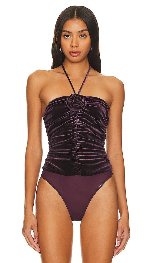 CAMI NYC Lupita Bodysuit in Purple. - size 10 (also in 12) CAMI NYC Lupita Bodysuit in Purple. - size 10 (also in 12) Self: 94% polyester 6% spandex Lining: 100% viscose. Made in China. Dry clean only. Gusset snap button closure with thong back. Hidden back zipper closure. Halterneck styling with tie detail. Front rosette detail. Ruched velvet fabric. CAMN-WS522. F23-CB11. The search for the perfect silk camisole is over. Cami NYC designs the perfect staple piece to compliment your wardrobe and refine your everyday style with a collection of camisoles in a variety of distinct styles and range of colors. Each and every camisole is classic, feminine and versatile. Shop the latest in fashion from CAMI NYC