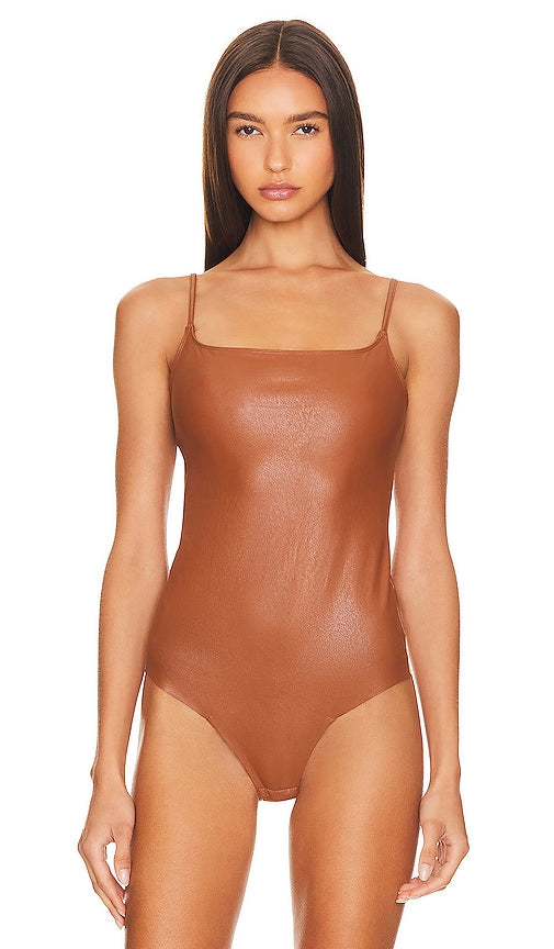 Commando Faux Leather Cami Bodysuit in Brown. - size M (also in S) Commando Faux Leather Cami Bodysuit in Brown. - size M (also in S) Self: 97% viscose 3% elastane Lining: 78% nylon 22% elastane. Made in China. Machine wash. Gusset snap button closure with thong back. Adjustable shoulder straps. Firming fabric with light compression. Faux leather fabric. CMAN-WS122. BDS309. Through innovative design and technical fabrics, commando creates versatile, luxurious pieces that make your wardrobe work harder so that your style can be effortless. From their sleek ballet bodysuits to their best-selling leggings and tights, to the raw-cut underwear that started it all, commando is the go-to brand for seasonless staples that you can build a look around. Shop the latest in fashion from Commando
