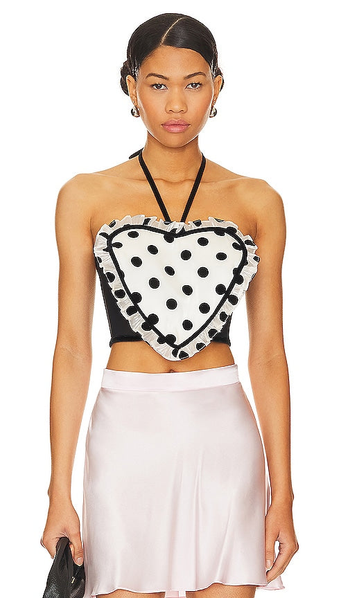 For Love & Lemons Peggy Top in Black. - size XS (also in L, M, S) For Love & Lemons Peggy Top in Black. - size XS (also in L, M, S) Self: 60% recycled polyester 40% polyester Lining: 98% recycled polyester 2% spandex Contrast Fabric: 84% polyamide 16% spandex. Made in China. Dry clean only. Back hook and eye closure. Halterneck styling. Heart shaped flocked velvet bodice with polka dot detail. FORL-WS580. CT2128-HO23. Derived from those sun-soaked Lemonade Stand Days designers and owners, Gillian Mahin and Laura Hall are the masterminds behind the line For Love & Lemons. Born in Wyoming, finding their style niche in Australia and now based in Los Angeles, the collection is anything but conventional-rebelling against the standards of modern society. The line taunts with intrigue as a clash of colors and patterns are evoked by chic separates and devious dresses. Where the modern gypsy is punk, For Love & Lemons is a brand to relate to, for that girl that doesn't follow trends, she makes them. Shop the latest in fashion from For Love & Lemons