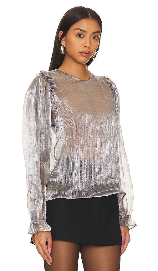 Free People Freya Frost Top in Metallic Silver. - size L (also in M, S, XS) Free People Freya Frost Top in Metallic Silver. - size L (also in M, S, XS) Shine in style with Free People's Freya Frost Top in Silver. It boasts a back loop button and back tie closure, blouson sleeves with elastic cuffs, and a semi-sheer metallic fabric that's perfect for a touch of glam in your outfit.. 100% polyester. Made in Vietnam. Machine wash. Back loop button and back tie closure. Blouson sleeves with elastic cuffs. Semi-sheer metallic fabric. FREE-WS4511. OB1837160. Free People invokes a spirit of femininity and creativity. Throughout their line of sweaters, tees, dresses and more, each piece incorporates a high level of quality and originality that reflects their adventurous it girl. With all that's constricting in the world today, Free People says your clothes don't have to be. Be yourself, be creative, be free. Shop the latest in fashion from Free People