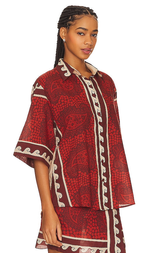 Johanna Ortiz Situation Shirt in Red. - size 2 (also in 6, 8) Johanna Ortiz Situation Shirt in Red. - size 2 (also in 6, 8) 100% cotton. Made in China. Dry clean only. Front button closure. Lightweight voile fabric. Item not sold as a set. JORR-WS10. PT01754. The brand is inspired by the woman behind the name and her effortless sense of style. Her signature lush flower prints, exuberant ruffles & the sophistication of South America have seduced women all over the world looking for an ebullient sense of Joie de Vivre Shop the latest in fashion from Johanna Ortiz