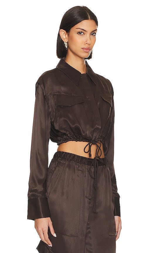 L'Academie Jace Blouse in Chocolate. - size L (also in M, S, XL, XS) L'Academie Jace Blouse in Chocolate. - size L (also in M, S, XL, XS) 100% viscose. Made in China. Hand wash. Front button closure. Blouson sleeves with button cuffs. Drawstring detail at hem. Front faux flap pockets. Lightweight satin fabric Item not sold as a set. LCDE-WS1023. LAS799 H23. L'Academie has mastered the art of elegant, sophisticated dressing with chic and polished pieces complete with stylish details. These contemporary pieces are effortlessly easy to style with your favorite denim or classic heels. Shop the latest in fashion from L'Academie