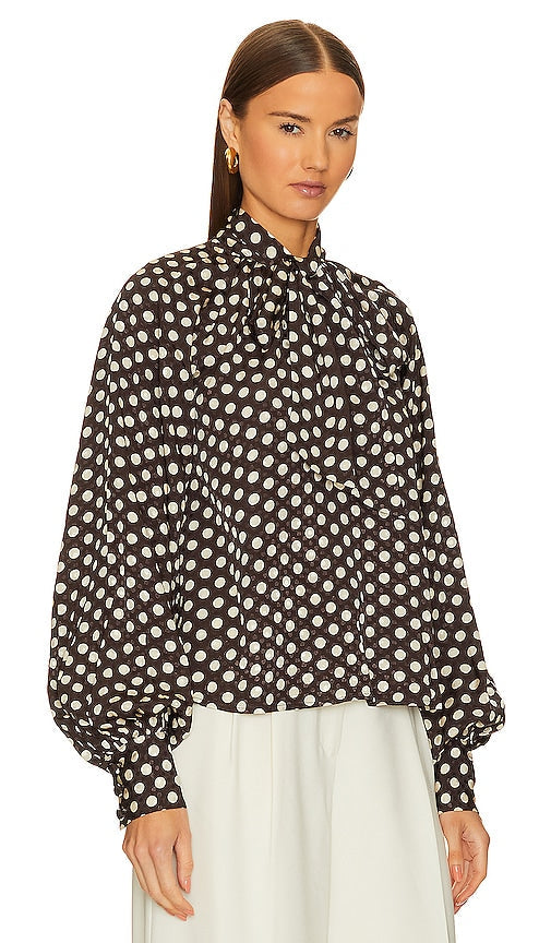 L'Academie Maelle Top in Brown. - size M (also in S, XS, XXS) L'Academie Maelle Top in Brown. - size M (also in S, XS, XXS) 68% viscose 34% rayon. Made in China. Hand wash. Front keyhole with draped tie closure. Puff sleeves with button cuffs. Satin fabric. LCDE-WS1026. LAS788 F23. L'Academie has mastered the art of elegant, sophisticated dressing with chic and polished pieces complete with stylish details. These contemporary pieces are effortlessly easy to style with your favorite denim or classic heels. Shop the latest in fashion from L'Academie