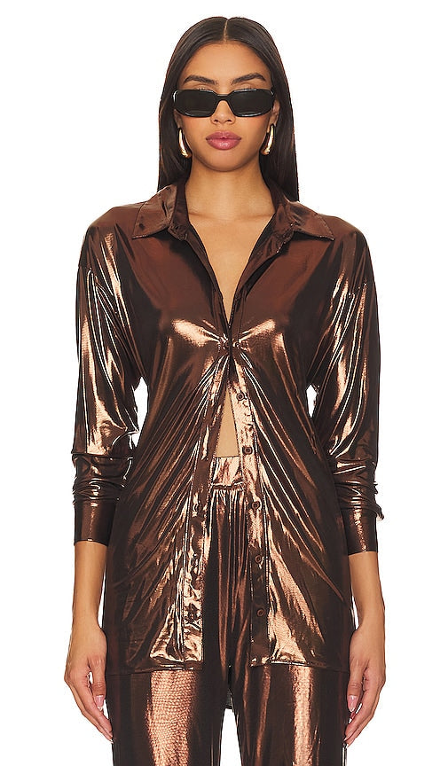 REMI x REVOLVE Yvette Button Up Shirt in Metallic Bronze - REMI x REVOLVE Chemise boutonnée Yvette en bronze métallisé - REMI x REVOLVE Yvette 金属古铜色纽扣衬衫 - REMI x REVOLVE Yvette Button-up-Hemd in Metallic-Bronze - REMI x REVOLVE Yvette 버튼업 셔츠 - Camicia REMI x REVOLVE Yvette con bottoni in bronzo metallizzato