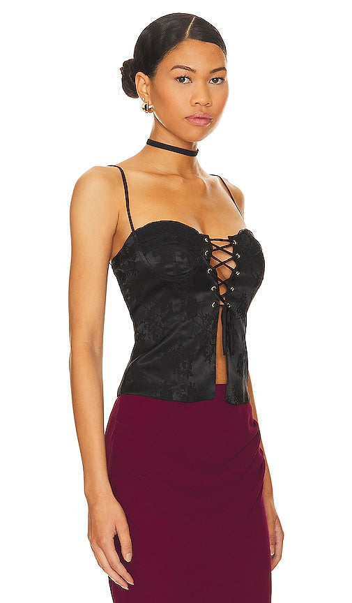 superdown Alana Corset Top in Black. - size L (also in M, S) superdown Alana Corset Top in Black. - size L (also in M, S) Dress to impress with the superdown Alana Corset Top in Black. Featuring a hidden side zipper closure, lace-up front, and adjustable shoulder straps for the perfect fit. The contour bust and satin fabric, adorned with a floral design, make it ideal for dressing up or down. Pair it with a maxi skirt or denim to elevate your style effortlessly.. Self: 100% polyester Lining: 95% polyester 5% spandex. Made in China. Hand wash. Hidden side zipper closure. Lace-up front. Adjustable shoulder straps. Contour bust Lightweight satin fabric. SPDW-WS1918. CT12783. superdown is a contemporary label offering on-demand, on-trend, on-social apparel. Always on the pulse of the latest styles, superdown is the go-to for aspiring, trendy, fashion-loving babes who are superdown for anything. Shop the latest in fashion from superdown
