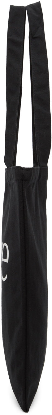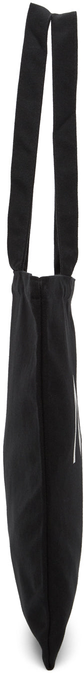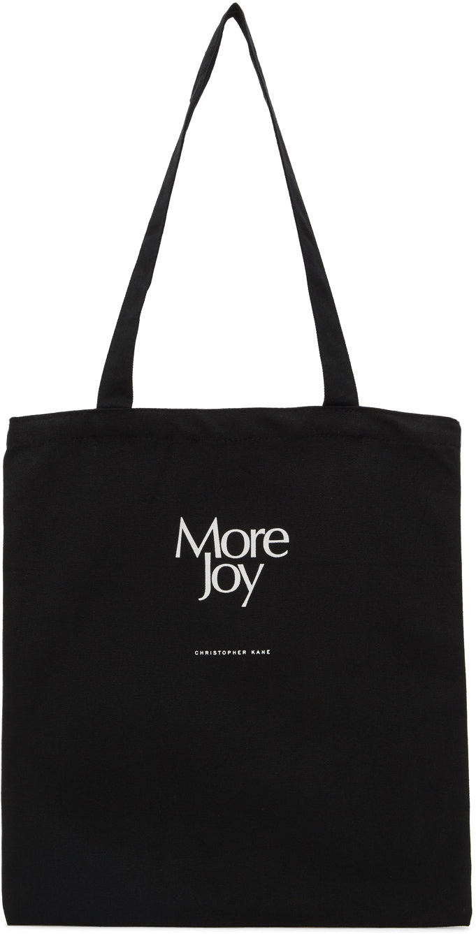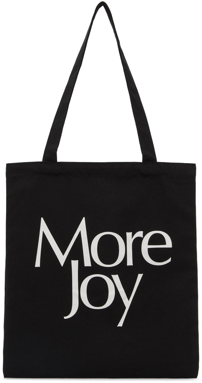 Cotton canvas tote bag in black. Twin carry handles at top. Logo printed in white at face and back face. Unlined. Approx. 15 length x 16 height. Supplier color: Black Cotton. Brand: More Joy