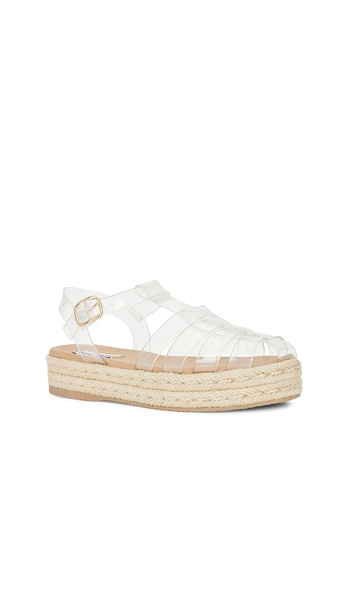 PVC upper with rubber sole. Made in China Fur origin: China. Adjustable ankle buckle closure. Faux leather footbed and lining. Side cut outs. Almond toe. Jute platform. Approx 25mm/ 1 inch platform. SMAD-WZ1467. MARL02S1494. The effortless west coast vibe of BB Dakota has now merged with the iconic Downtown edge of Steve Madden. Introducing Steve Madden Apparel... Inspired by confident women and its youthful New York City roots, Steve Madden apparel offers bold and disruptive, yet timeless essentials. Always at the forefront of trends and reinventing style season after season, Steve Madden apparel provides you with the tools you need to become your own fashion visionary. It's about authenticity. It's about embracing individuality. It's Steve Madden. Color: Clear. Shop Clear Platform Sandals for women and the latest Steve Madden shoes now.