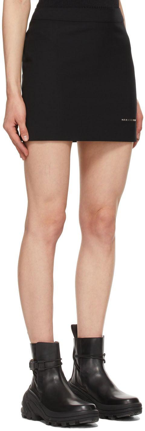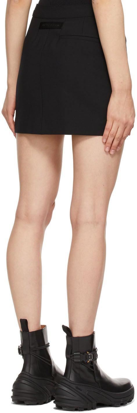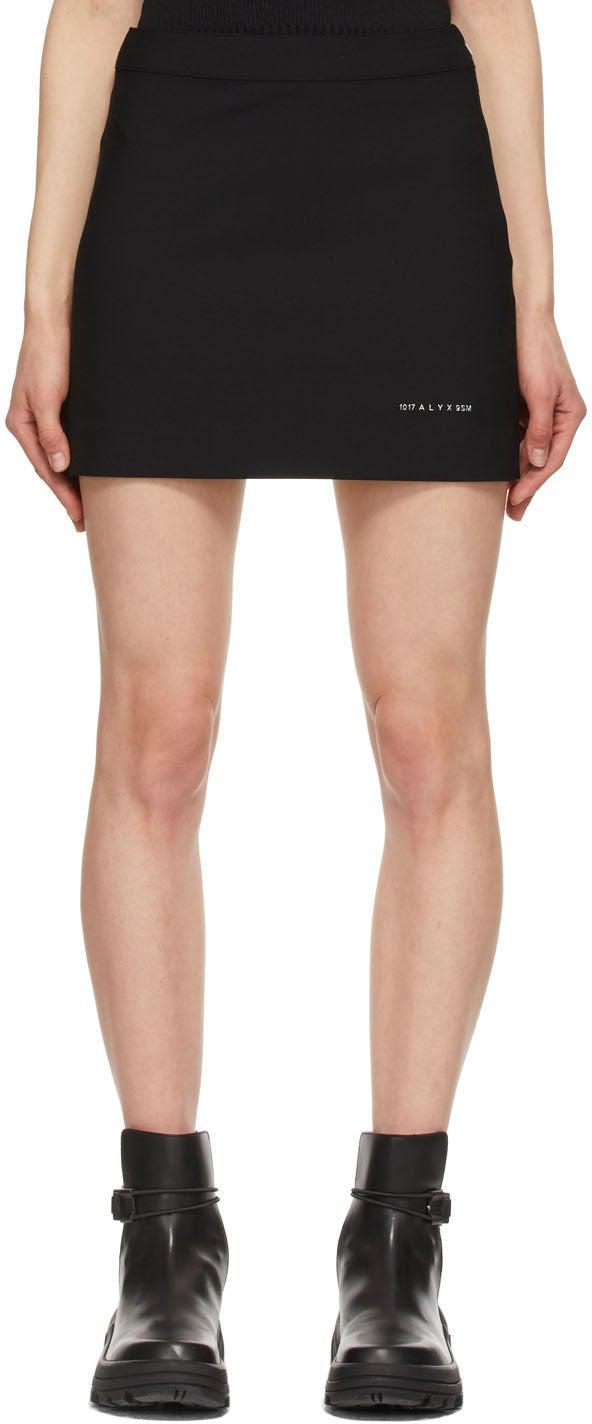 Plain-woven stretch wool-blend miniskirt in black. Mid-rise. Single-pocket styling. Logo hardware at front hem. Tonal webbing loop with embossed logo at back waistband. Zip closure at side-seam. Full tonal satin lining. Tonal and silver-tone hardware. Supplier color: Black Body: 53% polyester, 43% wool, 4% elastane. Lining: 62% acetate, 38% polyester. Brand: 1017 ALYX 9SM