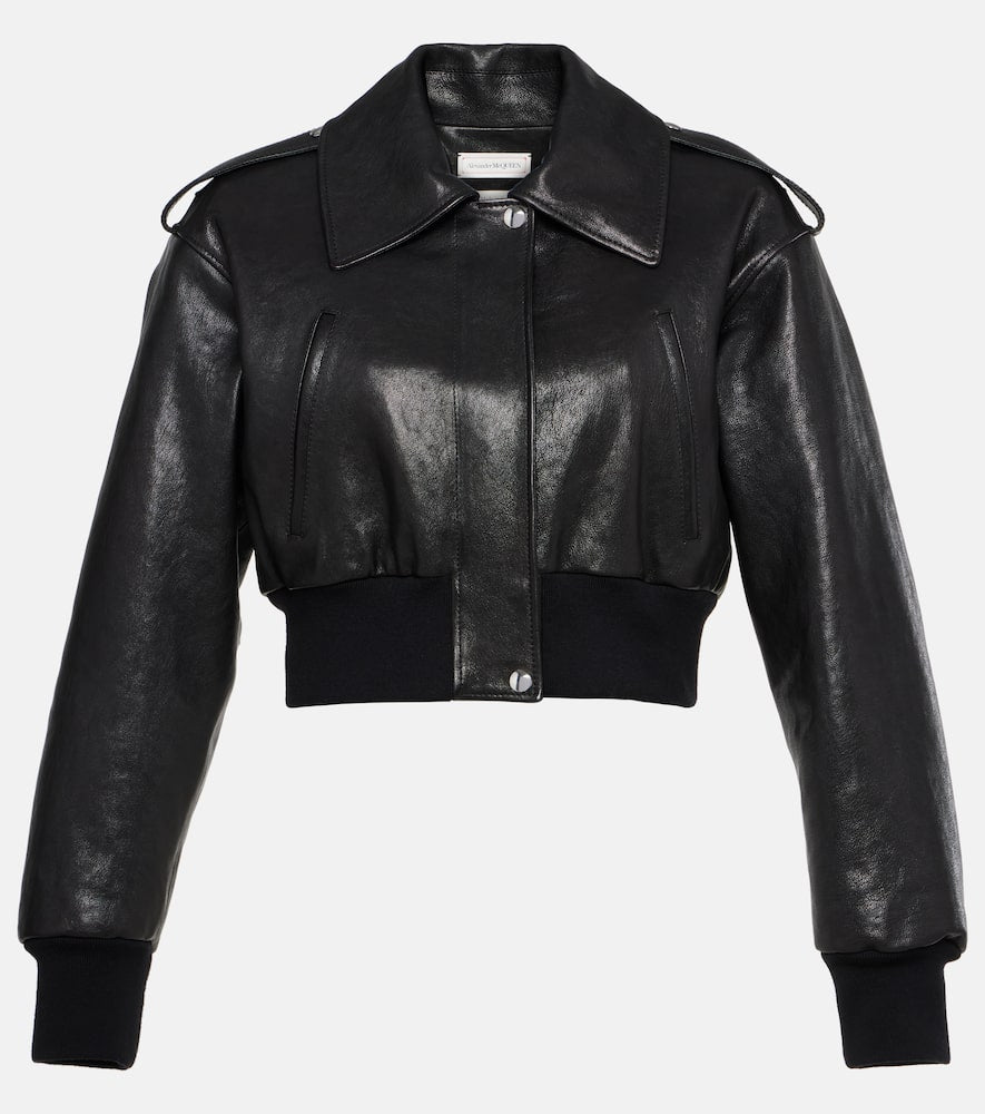 Material: 100% lamb leather. Care instructions: specialist clean. Made in Italy. Designer color name: Black. Length: cropped. Closure: zipper, snap-button fastenings. Hem: ribbed. Pockets: side slit pockets. Shop the latest Alexander McQueen Leather Jackets.