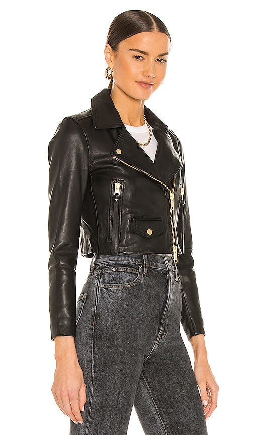 ALLSAINTS Elora Biker Jacket in Black. - size 0 (also in 10, 2, 4) ALLSAINTS Elora Biker Jacket in Black. - size 0 (also in 10, 2, 4) Self: 100% lamb leather Lining: 100% polyester. Made in India. Professional leather clean only. Two-way front zipper closure. Zipper pockets. Notched lapels with snap button closure. ALLR-WO80. W088LB. Founded in East London in 1994, AllSaints breaks through the noise to offer something different. Cult leather jackets and signature biker boots - it's what they do. Prints you weren't expecting, and accessories you'll keep coming back for. It's about innovation, about turning your back on the trends and making your own rules, a uniform without uniformity. AllSaints is an attitude, wear it your way. Shop the latest in fashion from ALLSAINTS