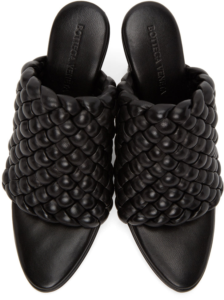 Intrecciato-woven lambskin slip-on sandals in black. Open almond toe. Logo embossed at tonal nappa footbed. Covered stiletto heel. Leather and pebble rubber sole in tan. Approx. 3.75 heel. Supplier color: Black Upper: lambskin. Sole: leather. Brand: Bottega Veneta