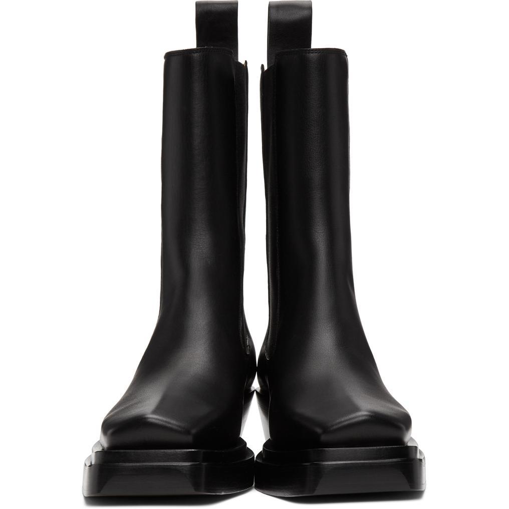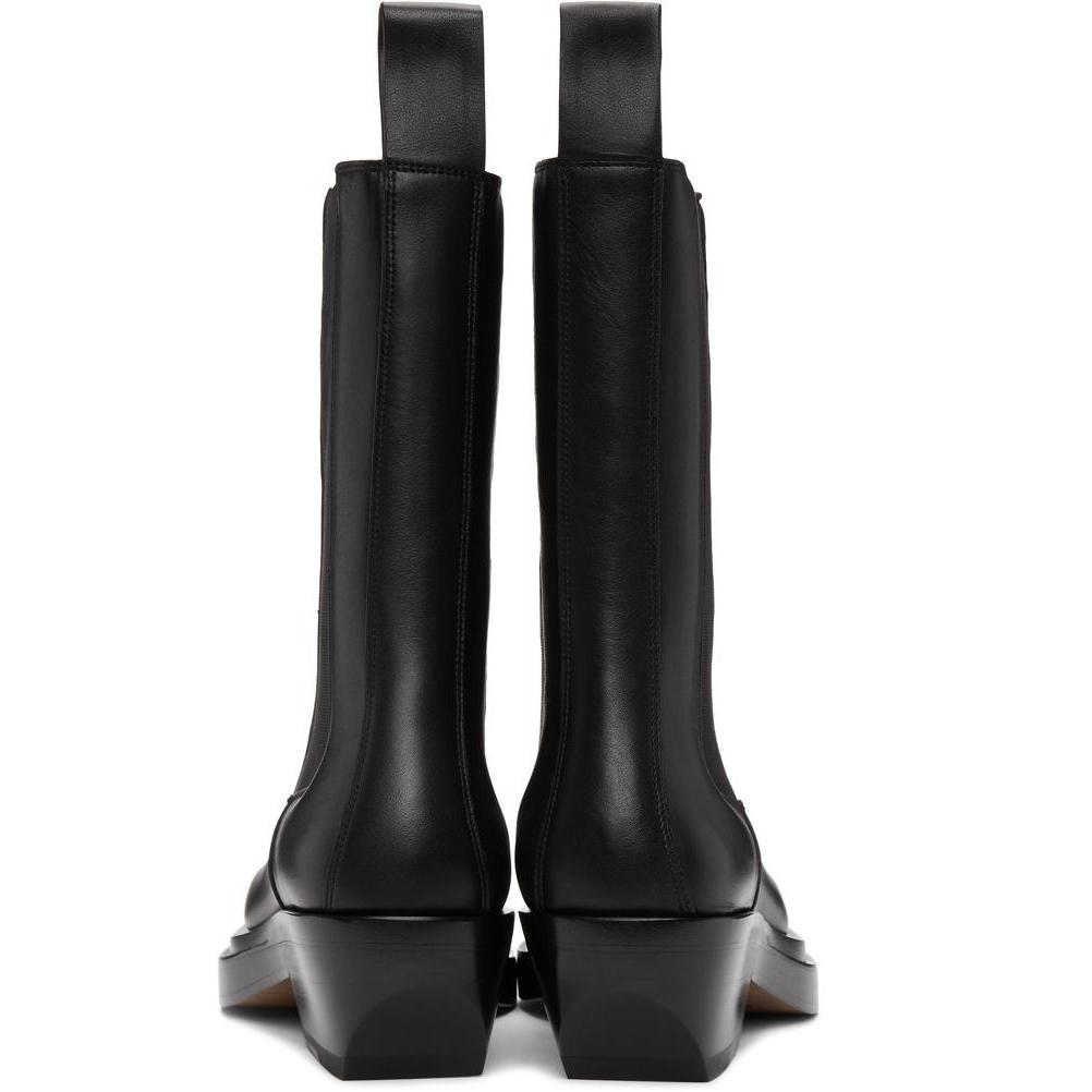 Mid-calf buffed calfskin Chelsea boots in black. Square toe. Tonal elasticized gusset at sides. Leather pull-loop at heel collar. Buffed calfskin lining in tan. Tonal stacked leather midsole. Leather outsole in tan. Approx. 1.75 heel. Supplier color: Black Calfskin. Brand: Bottega Veneta