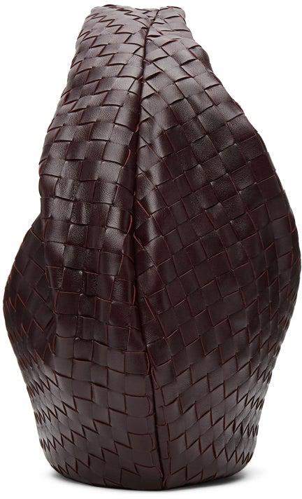 Intrecciato-woven grained lambskin shoulder bag in purple. Fixed shoulder strap featuring knotted accent at strap base. Zip closure. Zippered pocket and embossed logo at interior. Tonal calfskin lining. Gold-tone hardware. Approx. 21 length x 20 height x 8 width. Supplier color: Grape Lambskin, calfskin. Brand: Bottega Veneta