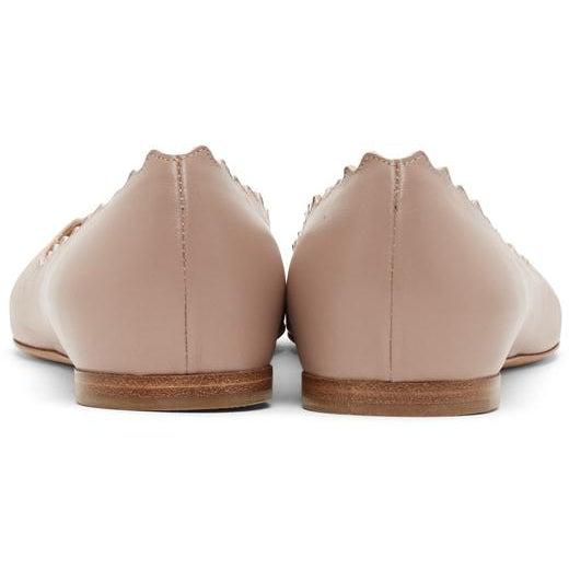 Nappa sheepskin ballerina flats in pink. Round toe. Scalloped edge at collar. Logo embossed at beige padded goatskin footbed. Goatskin lining in beige. Calfskin sole in tan with rubber injection at heel. Supplier color: Pink tea Upper: sheepskin, goatskin. Sole: calfskin. Brand: Chloé