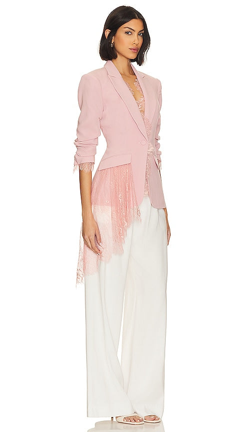 Cinq a Sept Keeves Blazer in Rose. - size 00 (also in 12) Cinq a Sept Keeves Blazer in Rose. - size 00 (also in 12) Self: 69% triacetate 31% polyester Contrast Fabric: 100% acrylic Lining: 100% polyester. Made in China. Dry clean only. Singular front button closure. Padded shoulders. Ruched sleeves. Front slap pockets. Lace fabric trim and draped detail. CINR-WO95. ZJ5351319Z. Cinq Sept is the time between late afternoon and early evening when the streets are awash in the warm glow of the vanishing sun and anything is possible. This beautiful meaning is highlighted throughout the lines collection - they strive to find that balance between day and night and sophistication and ease. Shop the latest in fashion from Cinq a Sept