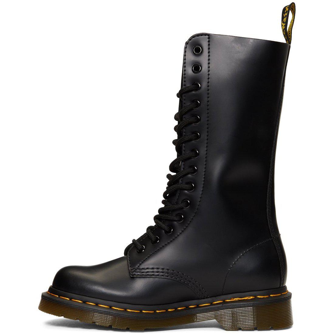 Calf-high buffed leather boots in black. Round toe. Tonal lace-up closure. Logo woven webbing pull-loop at heel collar. Topstitch detailing in yellow at welt. Signature Air Cushion outsole in tan. Tonal hardware. Supplier color: Black Upper: leather. Sole: rubber. Brand: Dr. Martens