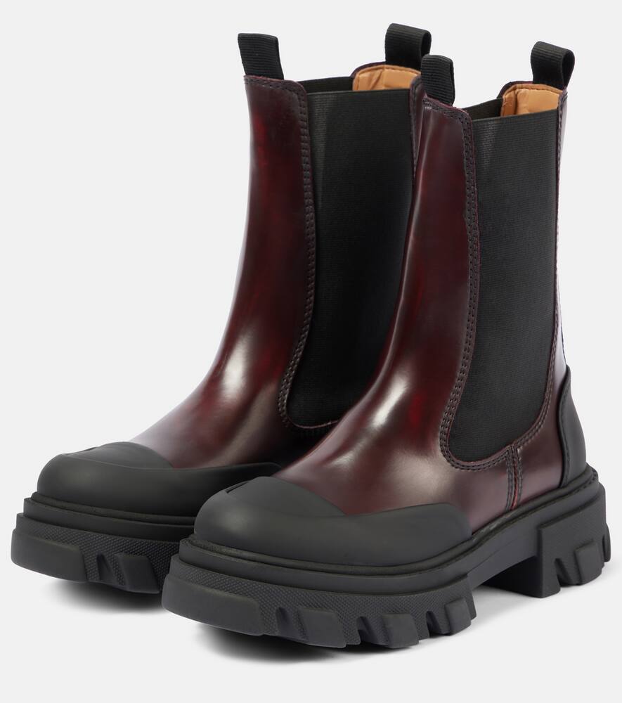 Upper: faux leather. Lining: faux leather. Sole: faux leather insole, rubber sole. Toe shape: round toe. Made in Portugal. Includes: shoe box, dust bag. Designer color name: Burgundy/Black. Trim: fabric. Closure: elasticated sides. Shop the latest Ganni Chelsea Boots for women now.