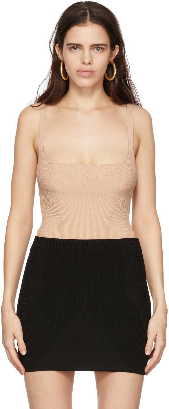Sleeveless stretch rib knit bodysuit in beige. Elasticized straps. Square neck collar. Adjustable press-stud fastening at bottom. Unlined. Tonal hardware. Supplier color: Natural 83% rayon, 17% polyester. Brand: Gauge81