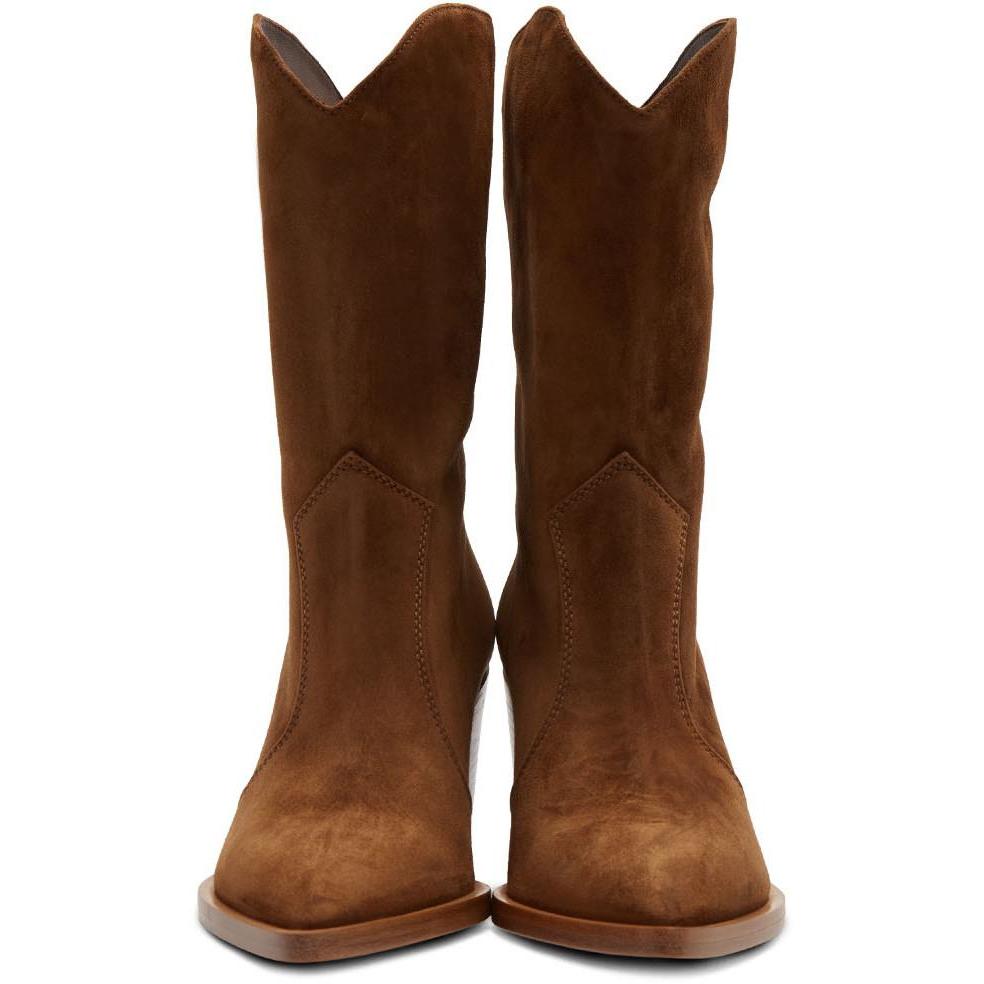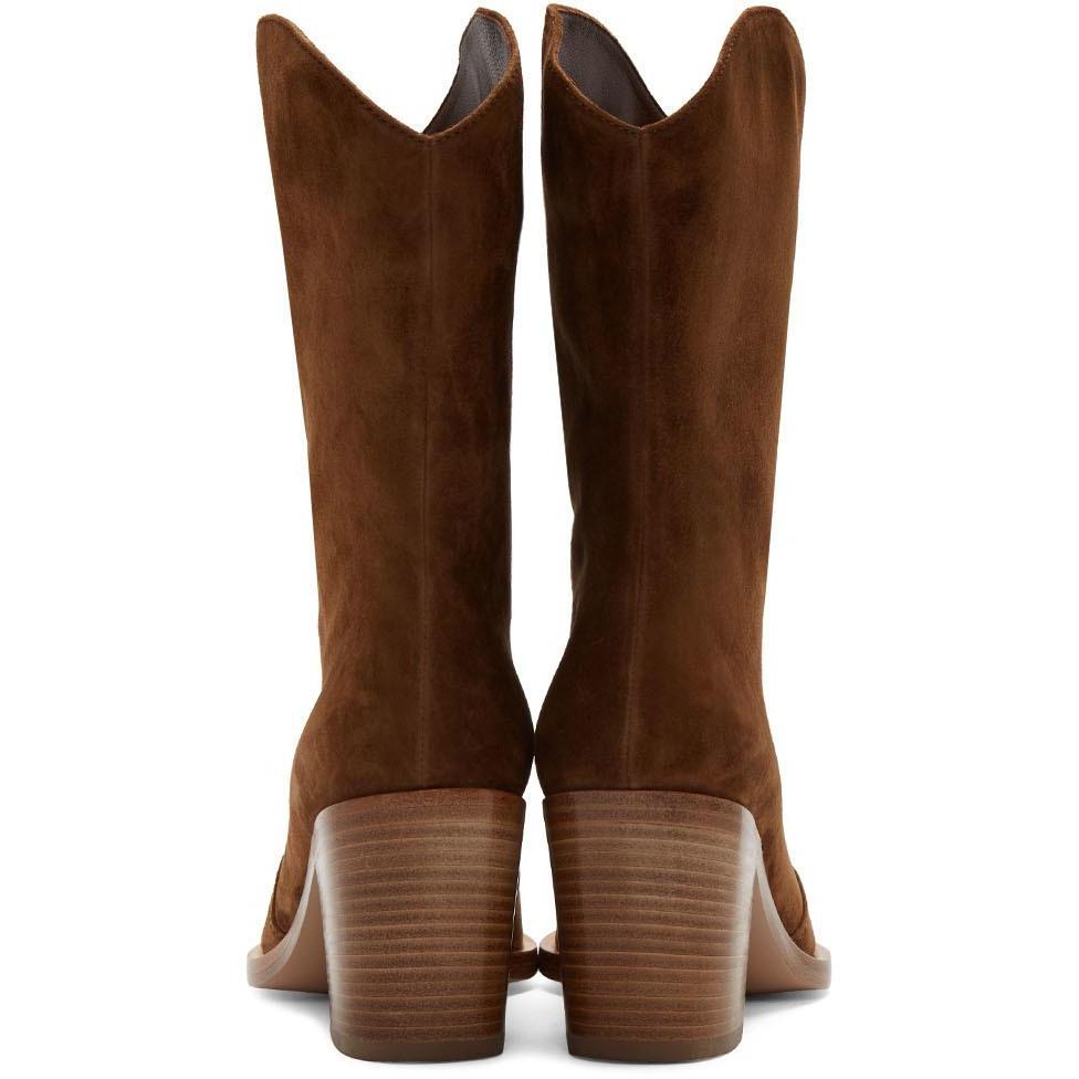 Ankle-high suede boots in brown. Pointed toe. Tonal grained leather lining. Tan stacked leather Cuban heel. Tan leather sole. Approx. 2.75 heel. This style fits small to size. Please take a half size up. Supplier color: Texas Leather. Brand: Gianvito Rossi