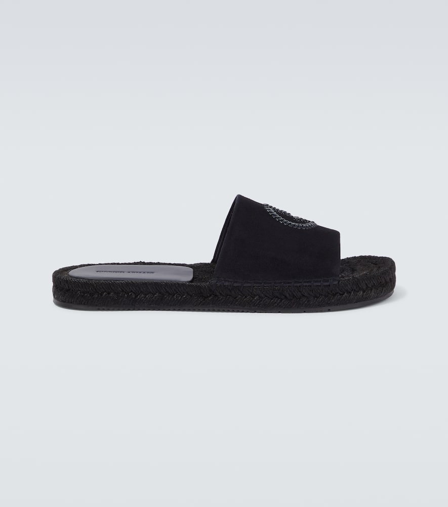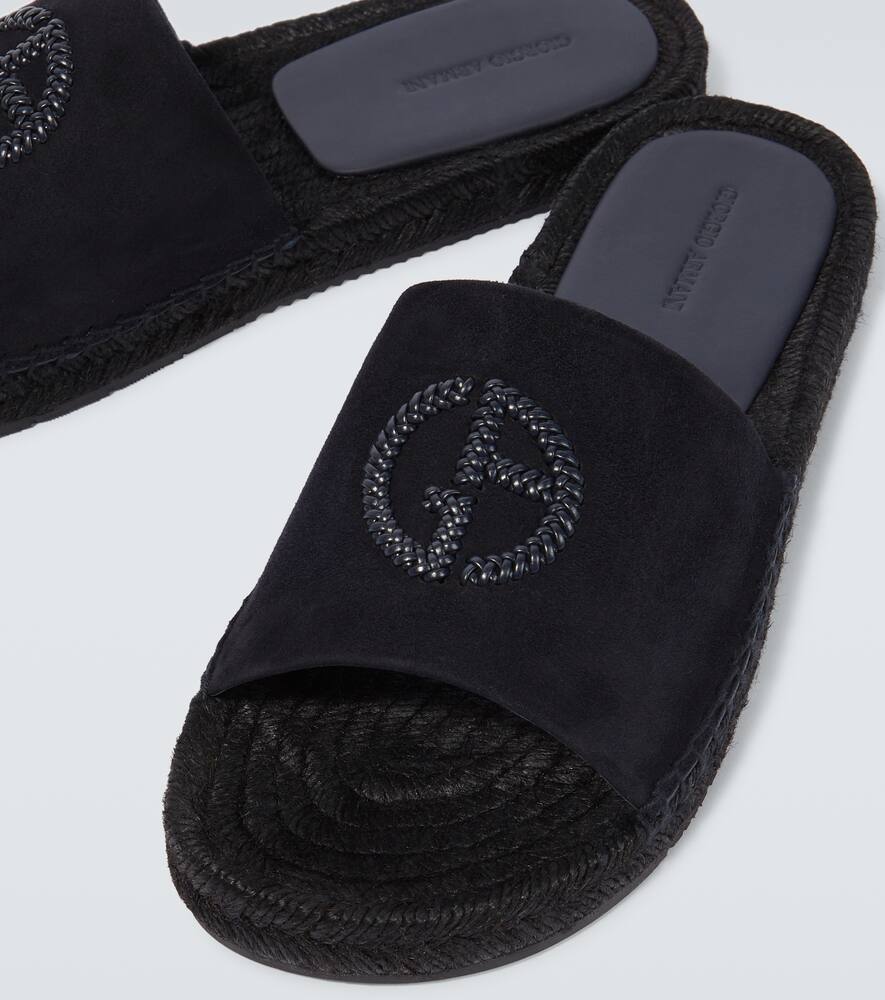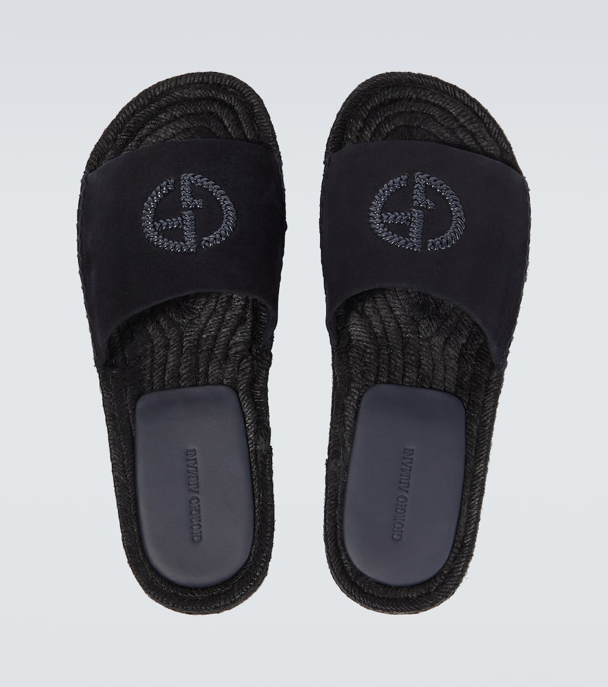 Toe shape: round open toe. Upper: fabric, leather. Sole: fabric insole, rubber sole. Made in Italy. Designer color name: Notte+Notte. Comes with dust bag. Shop Giorgio Armani Sandals & Slides for men and other designer shoes now.