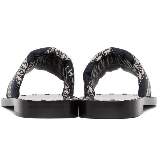 Jacquard woven slip-on sandals in navy featuring graphic logo pattern in white throughout. Padded strap at vamp. Leather lining. Flat stud detailing at footbed. Tonal leather sole. Silver-tone hardware. Supplier color: Navy/White Upper: textile. Sole: leather. Brand: Givenchy