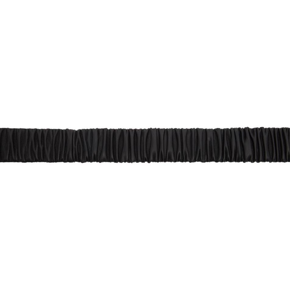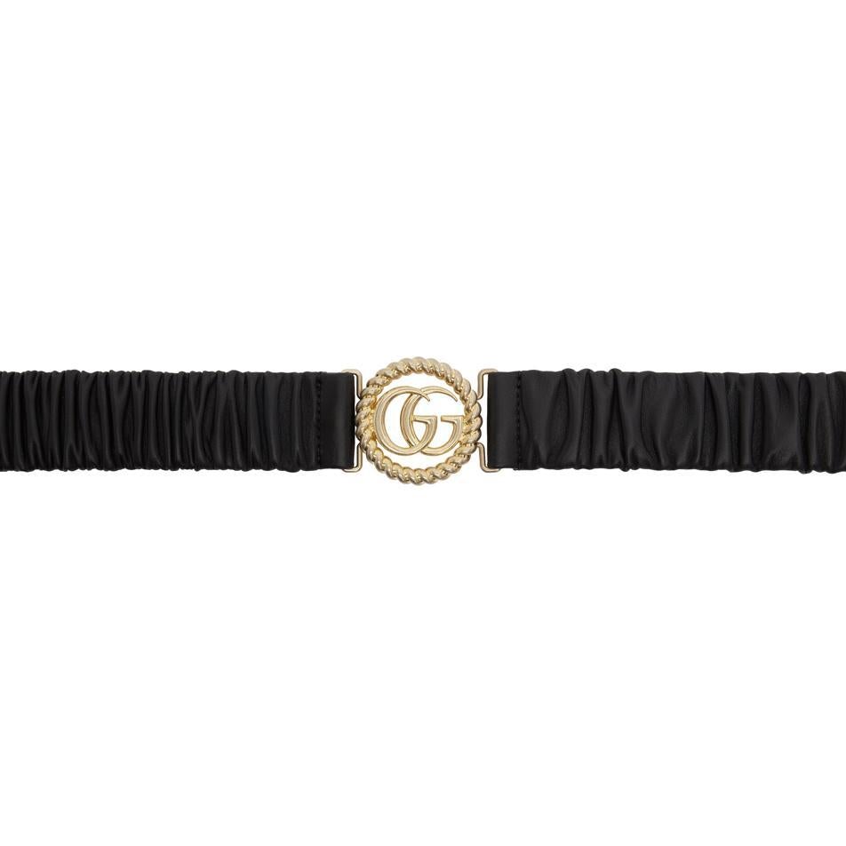 Elasticized buffed leather belt in black. Ruching throughout. Logo hardware at hook-eye fastening. Antiqued gold-tone hardware. Supplier color: Black Leather. Brand: Gucci