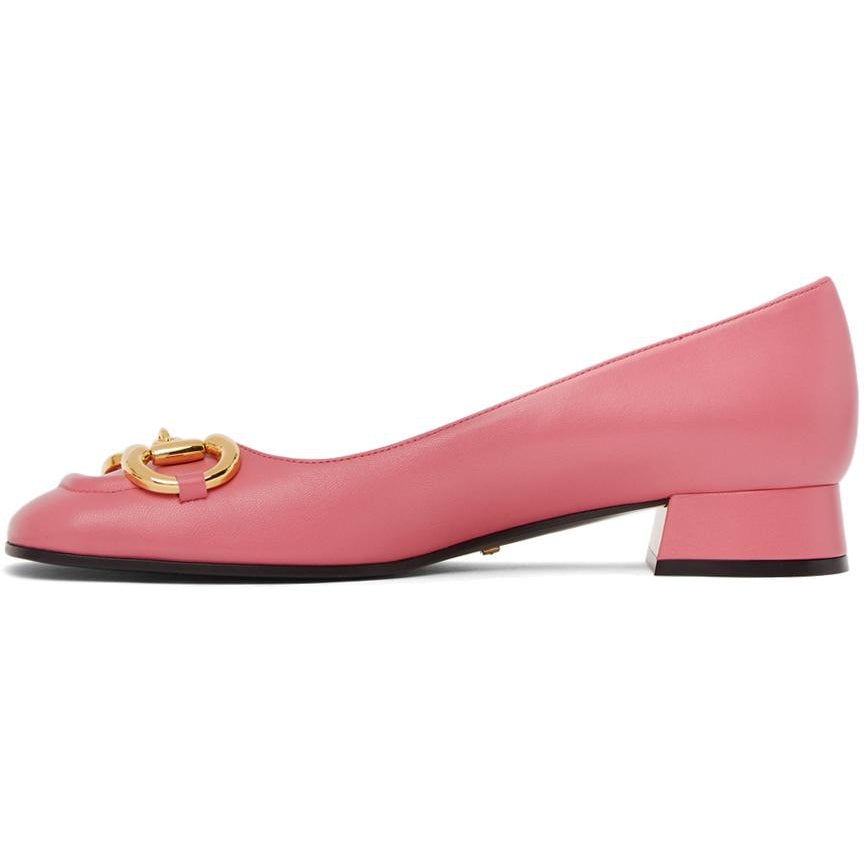 Buffed leather heels in pink. Horsebit hardware at square toe. Logo stamp in gold-tone at tan leather footbed. Covered block heel. Leather outsole in tan with rubber injection at heel. Gold-tone hardware. Approx. 1 heel. Supplier color: Pink Upper: leather. Sole: leather, rubber. Brand: Gucci