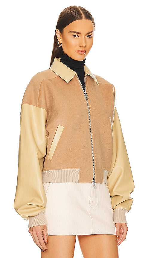 Helsa Faux Leather & Wool Blend Bomber in Tan. - size L (also in M, S, XL, XS, XXS) Helsa Faux Leather & Wool Blend Bomber in Tan. - size L (also in M, S, XL, XS, XXS) Self: 45% wool 45% recycled polyester 5% viscose 5% acrylic Lining: 55% polyester 45% rayon Contrast 1: 100% waterborne polyurethane Back: 33% polyester 30% nylon 30% cotton 7% elastane Contrast 2: 71% polyester 25% rayon 4% elastane. Made in China. Spot clean. Exposed front zipper closure. Faux side slant pockets. Ribbed cuffs and hem. Faux leather. HLSA-WO3. HEOW4 F22. Inspired by her Scandinavian heritage, founder Elsa Hosk honors the philosophy of timeless wardrobe staples, comfort, functionality, and minimalism. Influenced by the colors and materials found in nature, Helsa focuses on an Earth-First approach creating well-made pieces that offer a true sense of confidence and leisure that will last you season after season. Shop the latest in fashion from Helsa