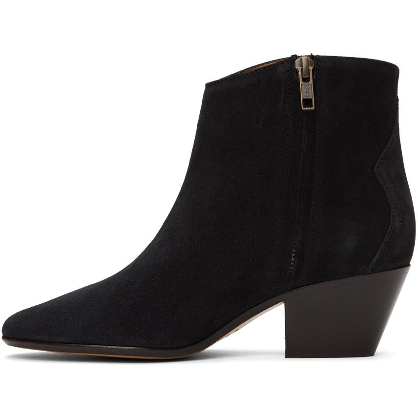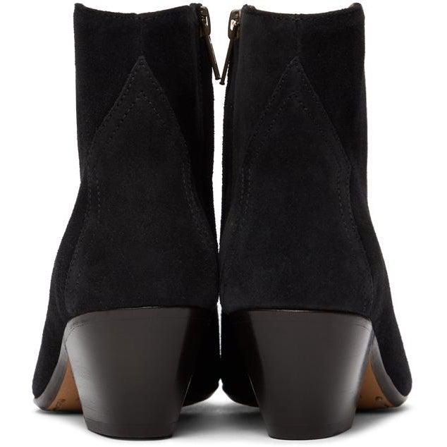 Ankle-high calfskin suede boots in black. Pointed toe. Zip closure at inner side. Tonal stacked leather Cuban heel. Leather sole in beige. Antiqued gold-tone hardware. Approx. 2 heel. Supplier color: Faded black Upper: calfskin. Sole: leather. Brand: Isabel Marant