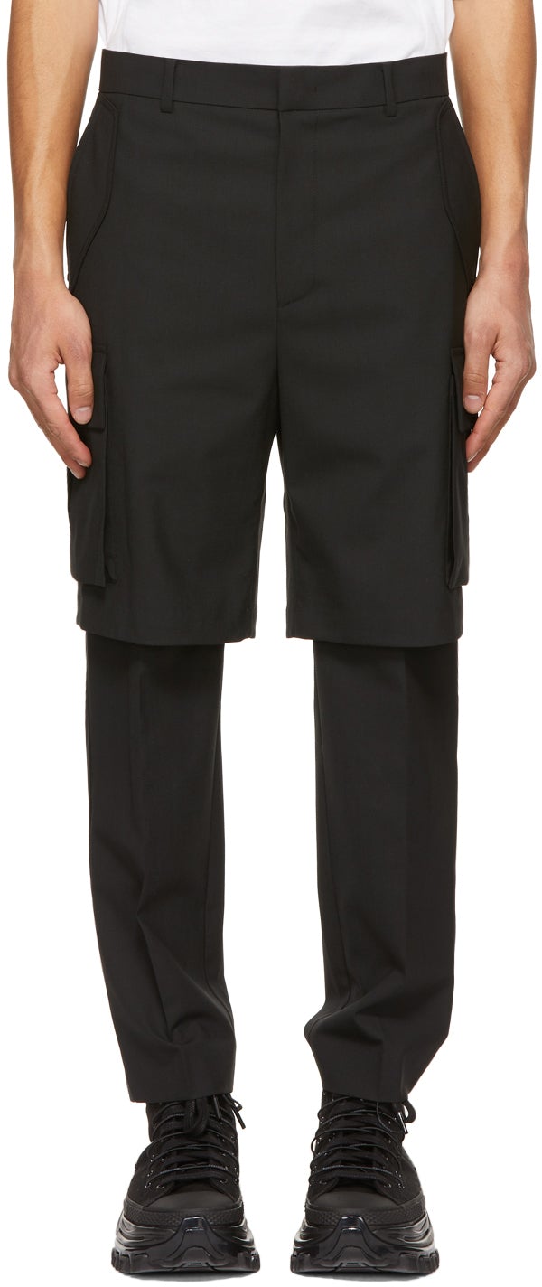 Straight-leg paneled wool-blend canvas cargo pants in black. Mid-rise. Layered construction. Four-pocket styling. Belt loops at waistband. Central creases at front and back. Flap pocket at outseams. Partial viscose-blend satin lining. Zip-fly. Tonal hardware. Supplier color: Black Body: 49% polyester, 47% wool, 4% polyurethane. Lining: 55% viscose, 45% nylon. Brand: Juun.J