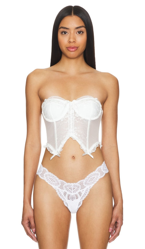 KAT THE LABEL Sofia Corset in White. - size L (also in M, S, XL, XS) KAT THE LABEL Sofia Corset in White. - size L (also in M, S, XL, XS) 63% polyamide 30% polyester 7% elastane. Made in China. Cold wash only. Unlined. hook & eye closure. KTHE-WI213. KT-24-15-W. Fiercely feminine designs with the option to be exposed or hidden, each KAT THE LABEL garment is designed to lace you with confidence. They believe lingerie is the match which ignites one's sensuality and confidence, because there's no closer relationship than pairing your skin with your lingerie. KAT THE LABEL designs items to be cherished as keepsake or staple piece, to stand the test of time through quality fabrics & trims and unique designs. From embellished metallic threads to signature eyelash lace, your KTL piece will never disappoint. Shop the latest in fashion from KAT THE LABEL
