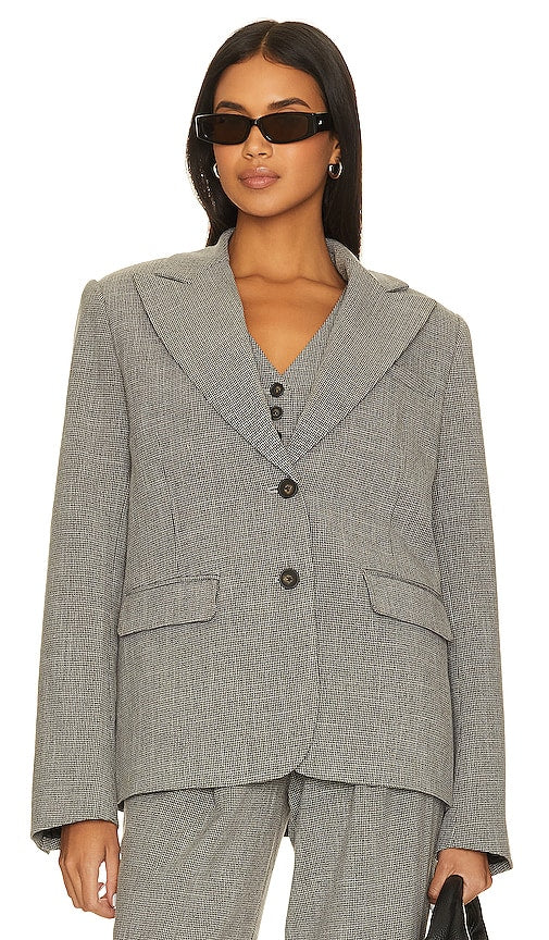 L'Academie Maiara Blazer in Grey. - size L (also in M, S, XL) L'Academie Maiara Blazer in Grey. - size L (also in M, S, XL) Self: 47% rayon 46% polyester 4% nylon 3% elastane Lining: 55% polyester 45% viscose. Made in China. Hand wash. Front button closure with button cuffs. Front flap pockets. Padded shoulders. Suiting fabric with oversized fit. Item not sold as set. LCDE-WO229. LAOW209 F23. L'Academie has mastered the art of elegant, sophisticated dressing with chic and polished pieces complete with stylish details. These contemporary pieces are effortlessly easy to style with your favorite denim or classic heels. Shop the latest in fashion from L'Academie
