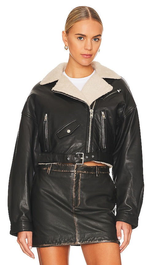 LAMARQUE Dylan Sherpa Moto Jacket in Black. - size L (also in M, S, XL) LAMARQUE Dylan Sherpa Moto Jacket in Black. - size L (also in M, S, XL) Self: 100% lamb leather Faux Fur: 100% polyester Lining: 97% polyester 3% spandex. Made in India. Professional leather clean only. Front zipper closure. 4-pocket design. Detachable belt at hem. Zipper cuffs. Smooth leather fabric with faux fur trim. LARX-WO181. 6830. LAMARQUE specializes in luxurious leather garments, contemporary apparel & elevated outerwear. Designed in Montreal by Creative Director Ifigenia Papadimitriou, the brand is committed to achieving the essence of urban elegance with each design, from polished silk blouses to classically cool leather bikers and everything in between. Season after season, the collection remains perfectly timeless, yet with an iconic, fashion-forward edginess. Shop the latest in fashion from LAMARQUE