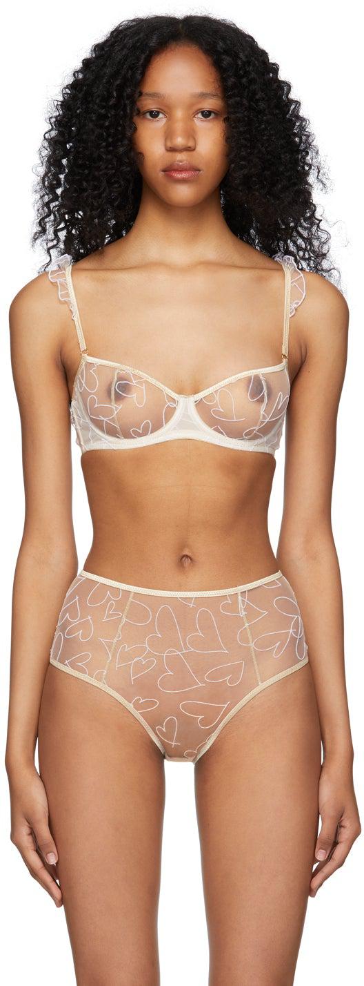 Sheer stretch tulle bra in beige. Pattern embroidered in white throughout. Adjustable cinch shoulder straps featuring ruffled tulle trim. Underwire at cups. Adjustable hook-eye fastening at back. Gold-tone hardware. Supplier color: Beige 93% polyamide, 7% elastane. Brand: Le Petit Trou