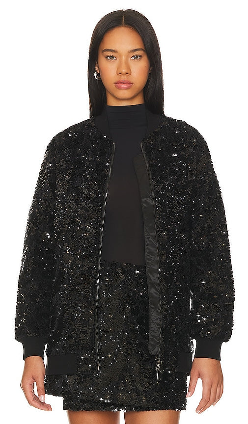 Le Superbe Grand Prix Long Bomber Jacket in Black. - size M (also in S, XS) Le Superbe Grand Prix Long Bomber Jacket in Black. - size M (also in S, XS) Self & Lining: 100% polyester Contrast Fabric: 100% cotton. Made in China. Dry clean only. Front zipper closure. Side seam pockets. Sequined fleece fabric. Item not sold as set. LSPB-WO19. #FW23-6031. Le Superbe is a Los Angeles fashion brand that stays true to its California roots, while at the same time unleashing a personal flair. It's Ready-to-Wear sprinkled with subliminal seeds of the surf culture along the sandy beaches of Southern California. The must-have pieces change with the seasons but stay true to a stylistic freedom that embraces an effortless mix of new and vintage, high and low. Operating on instinct and impeccable taste, the Los Angeles designers draw inspiration from the streets of Hollywood, all the way to Venice Beach to Malibu. The goal is always a fabulous stylist rack of must-have items. Shop the latest in fashion from Le Superbe