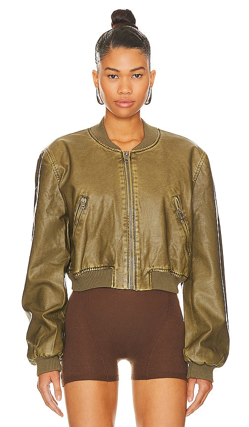 LIONESS Allure Bomber in Olive. - size XL (also in XXL) LIONESS Allure Bomber in Olive. - size XL (also in XXL) 55% polyurethane 45% polyester. Made in Australia. Hand wash. Front zipper closure. Side slant zipper pockets. Padded shoulders. Elastic neckline, cuffs and hem. Soft faux leather fabric. LIOR-WO12. LC580-2-2307. Australian brand Lioness balances luxurious neutral hues with deep tonal shades on intricate shapes. With the ultimate model off duty feel, the aesthetic is fueled by music, art, love and exploration. With continued success in high street wear Lioness slays at confident silhouettes, fem cut out dresses and rompers you'll never want to take off. Since opening its doors in 2009, Lioness has become a must have destination for IT girls around the world with a host of fans among celebrities and fashion bloggers. Shop the latest in fashion from LIONESS