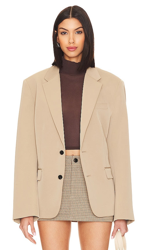 Lovers and Friends Joan Blazer in Tan. - size L (also in M, S, XL, XS, XXS) Lovers and Friends Joan Blazer in Tan. - size L (also in M, S, XL, XS, XXS) You mean business in this tailored blazer from Lovers & Friends, featured with dramatic padded shoulder for some structural flair. This sleek but so-fun number is the perfect finishing layer over a baby tee and mini skirt.. Self: 97% polyester 3% spandex Lining: 100% polyester. Made in China. Dry clean only. Front button closure. Welt pocket at breast. Side flap pockets. Padded shoulders with buttoned cuffs. LOVF-WO536. LFOW351 R23. Constantly inspired by the laid back Los Angeles lifestyle in which the brand was founded, Lovers and Friends exudes ease and wearability, creating an effortlessly chic look that is California cool. Shop the latest in fashion from Lovers and Friends