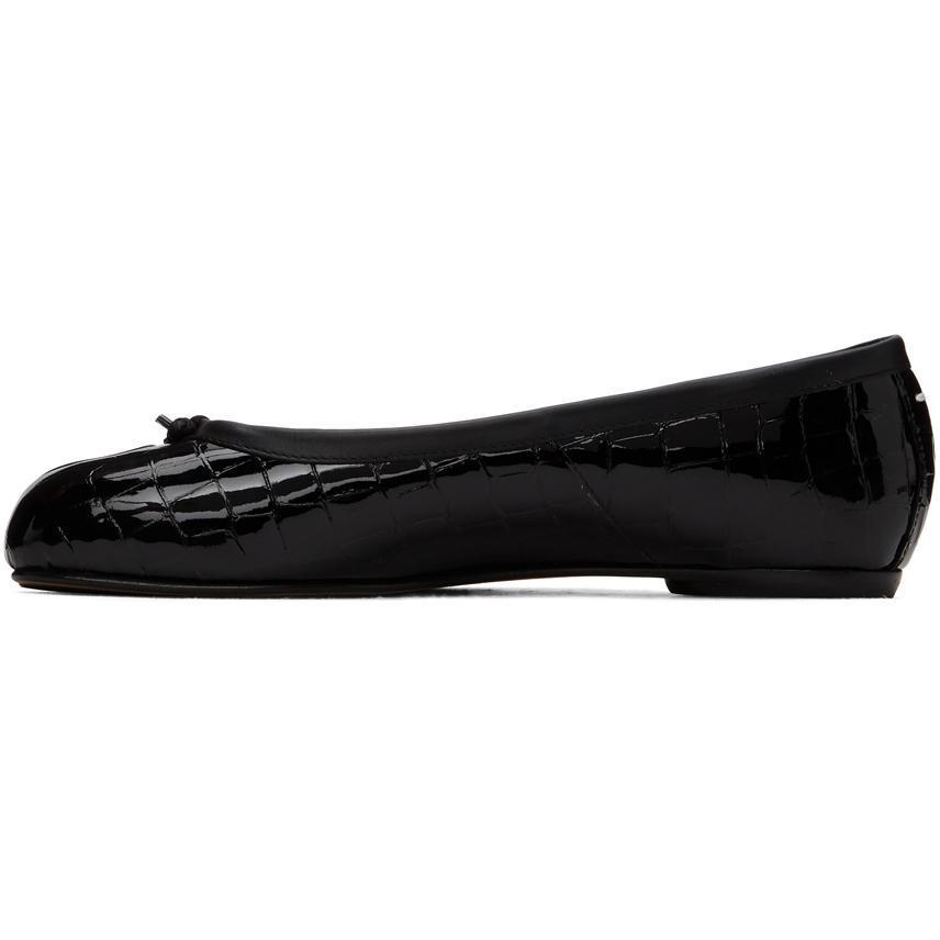 Croc-embossed polished leather ballerina flats in black. Square cleft toe. Bow accent at vamp. Signature white stitch at heel collar. Leather sole in tan. Supplier color: Black Upper: leather. Sole: leather. Brand: Maison Margiela