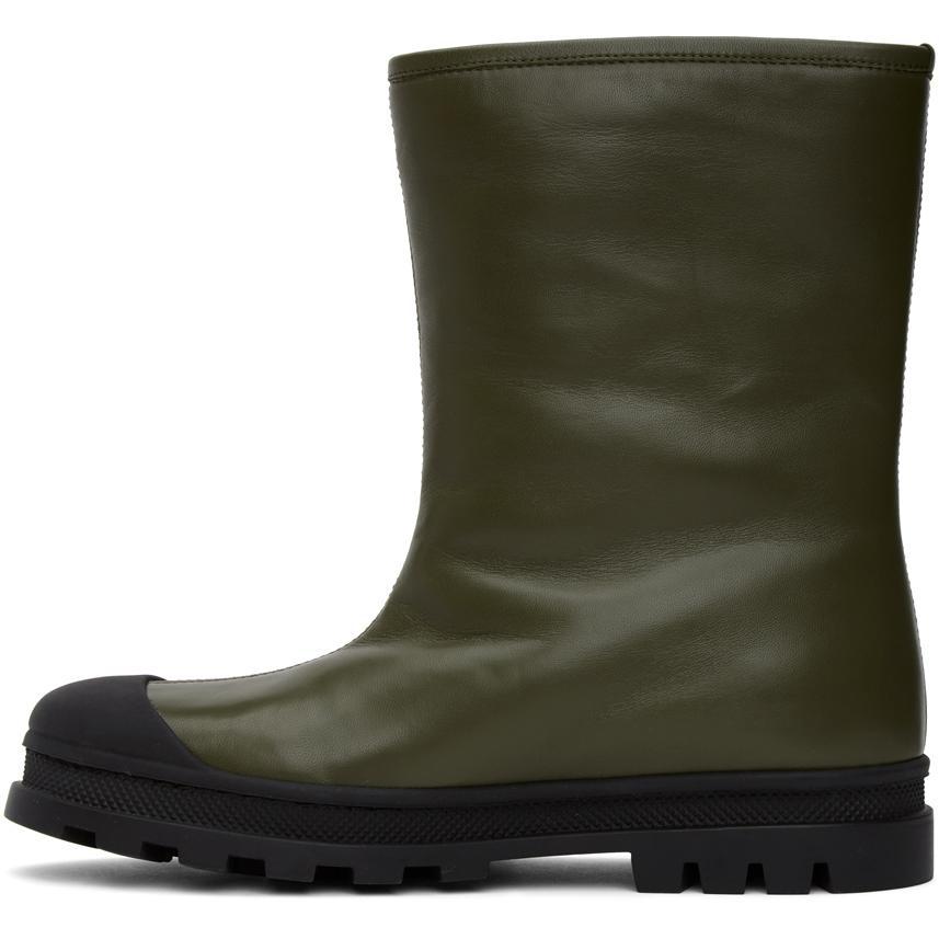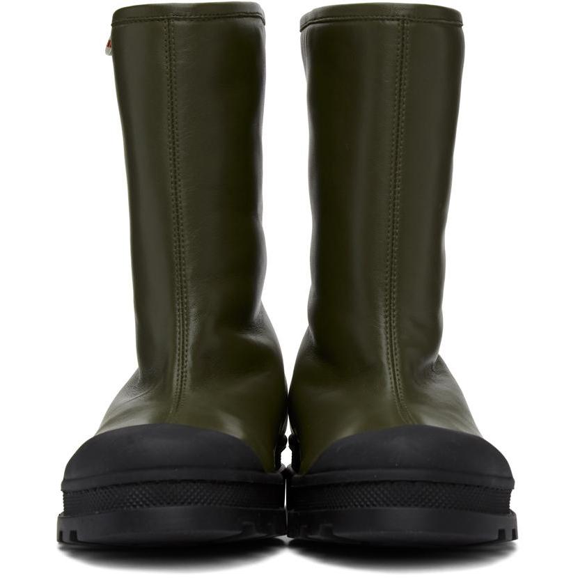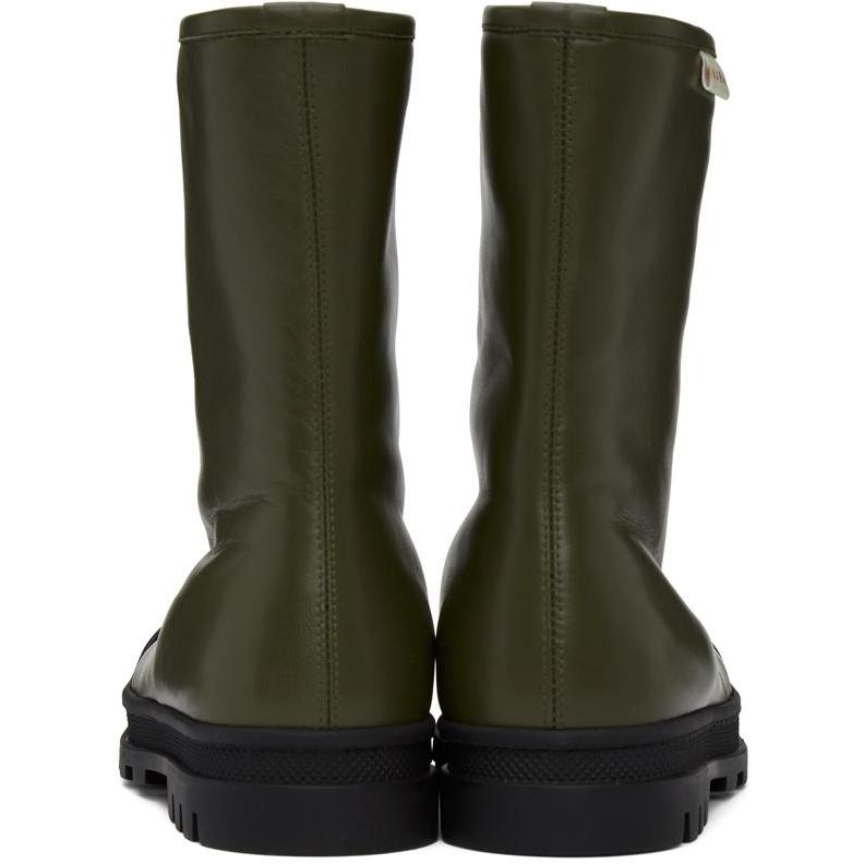 Mid-calf buffed leather boots in khaki. Round rubber cap toe in black. Logo flag in white and red at collar. Buffed leather lining. Treaded rubber sole in black. Supplier color: Dark olive Upper: leather. Sole: rubber. Brand: Marni