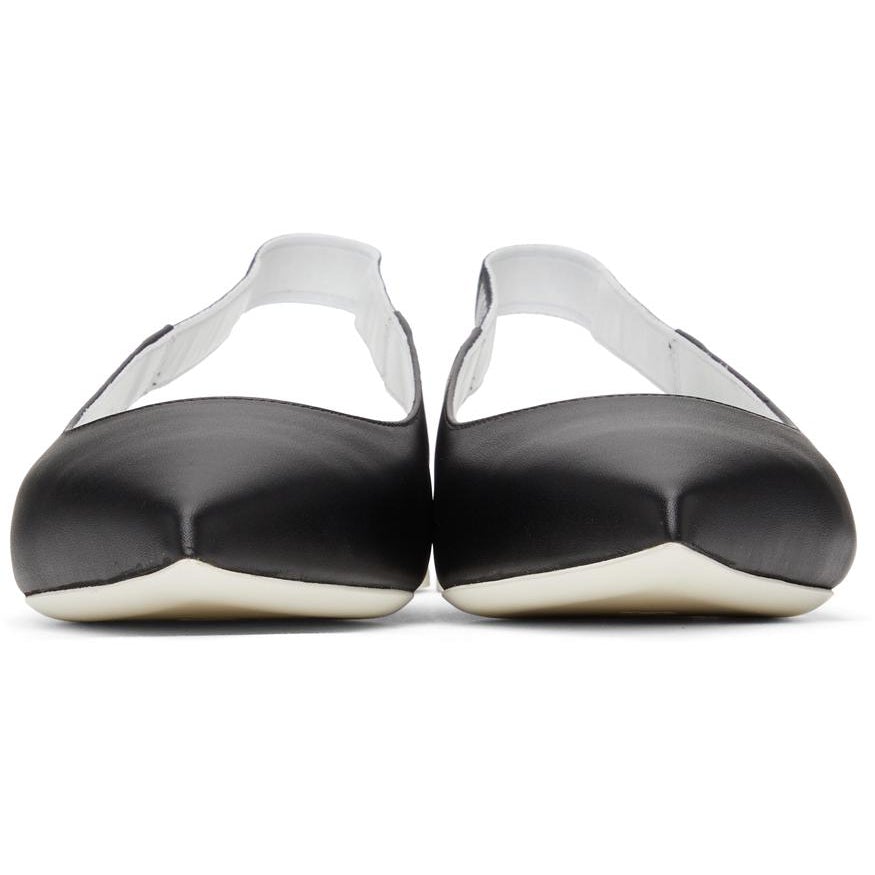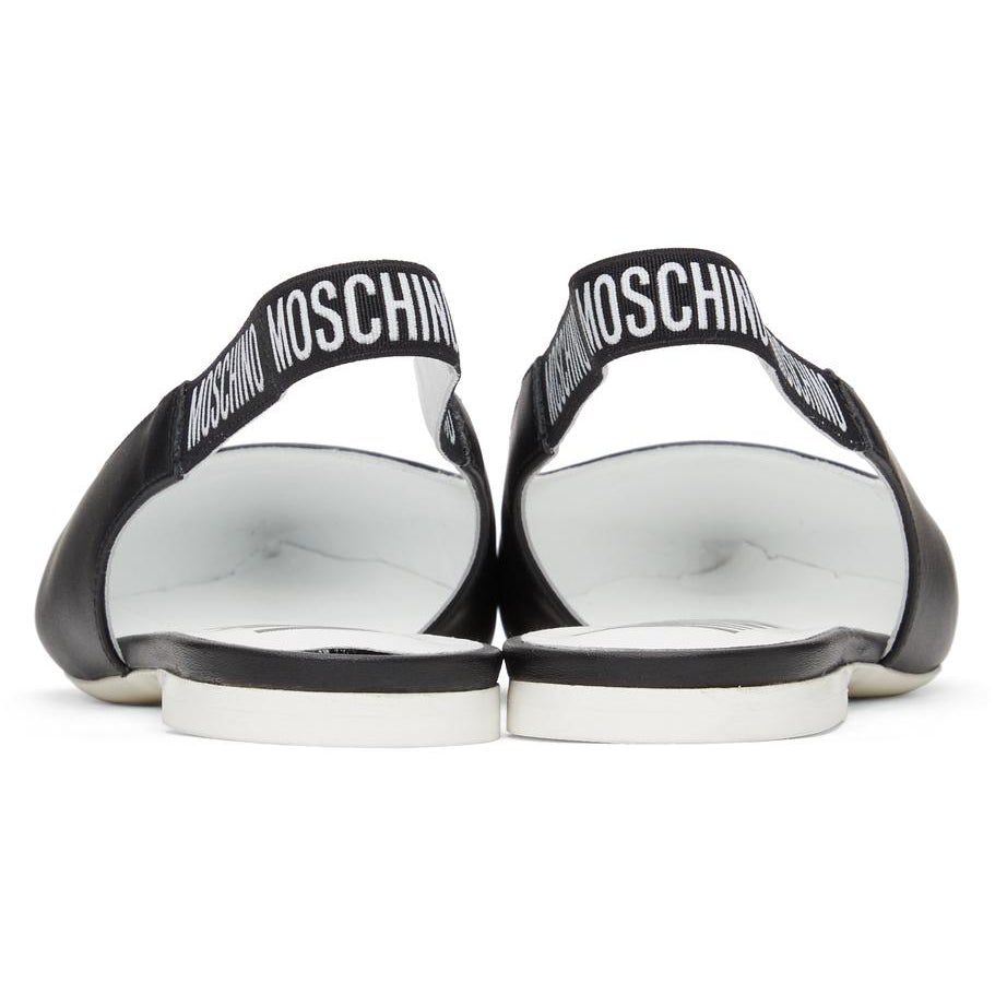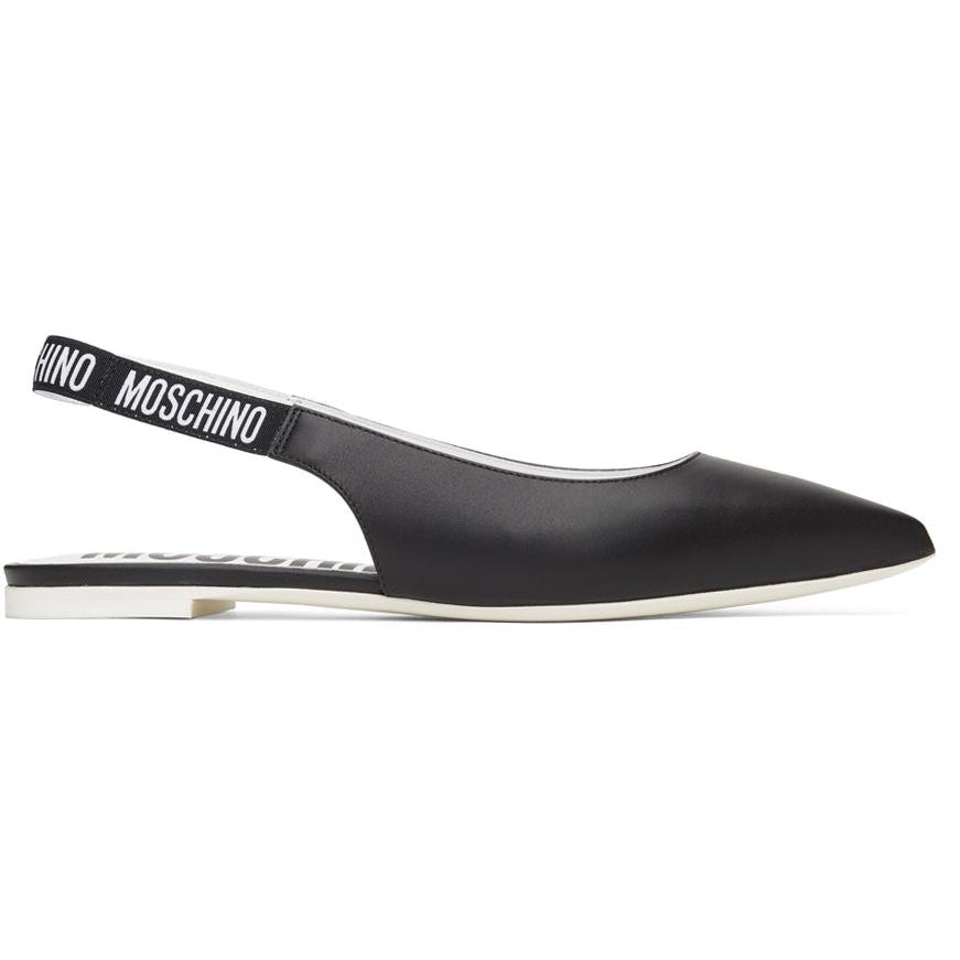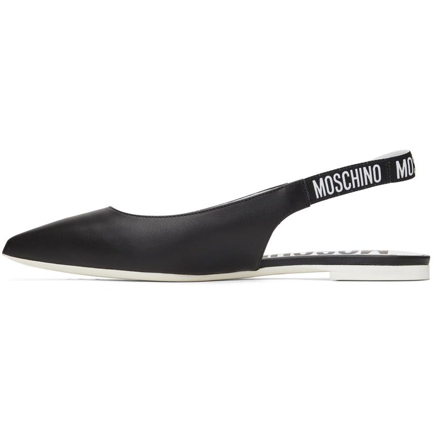 Buffed leather ballerina flats in black. Pointed toe. Tonal printed logo at buffed leather footbed in white. Tonal elasticized logo-woven slingback strap. Leather sole in white. Supplier color: Black Leather. Brand: Moschino