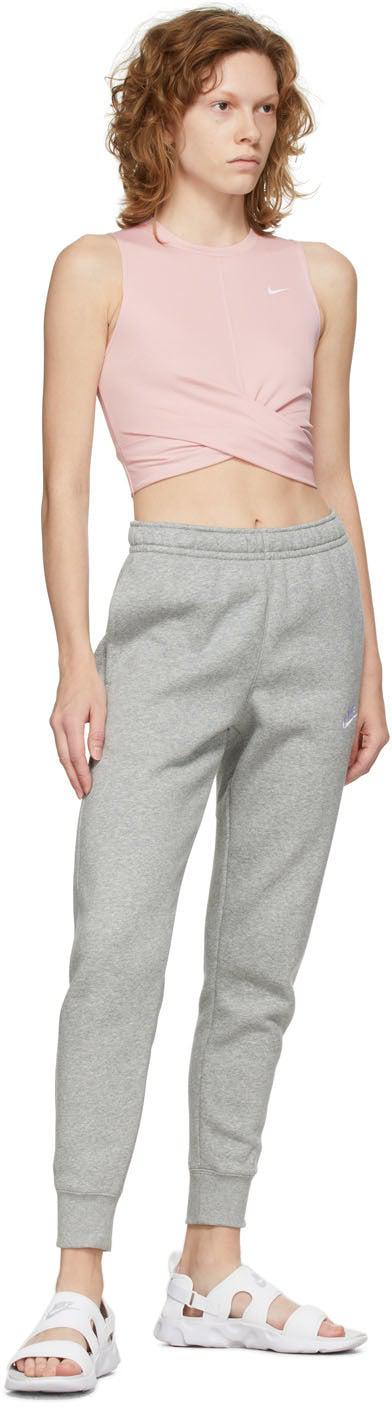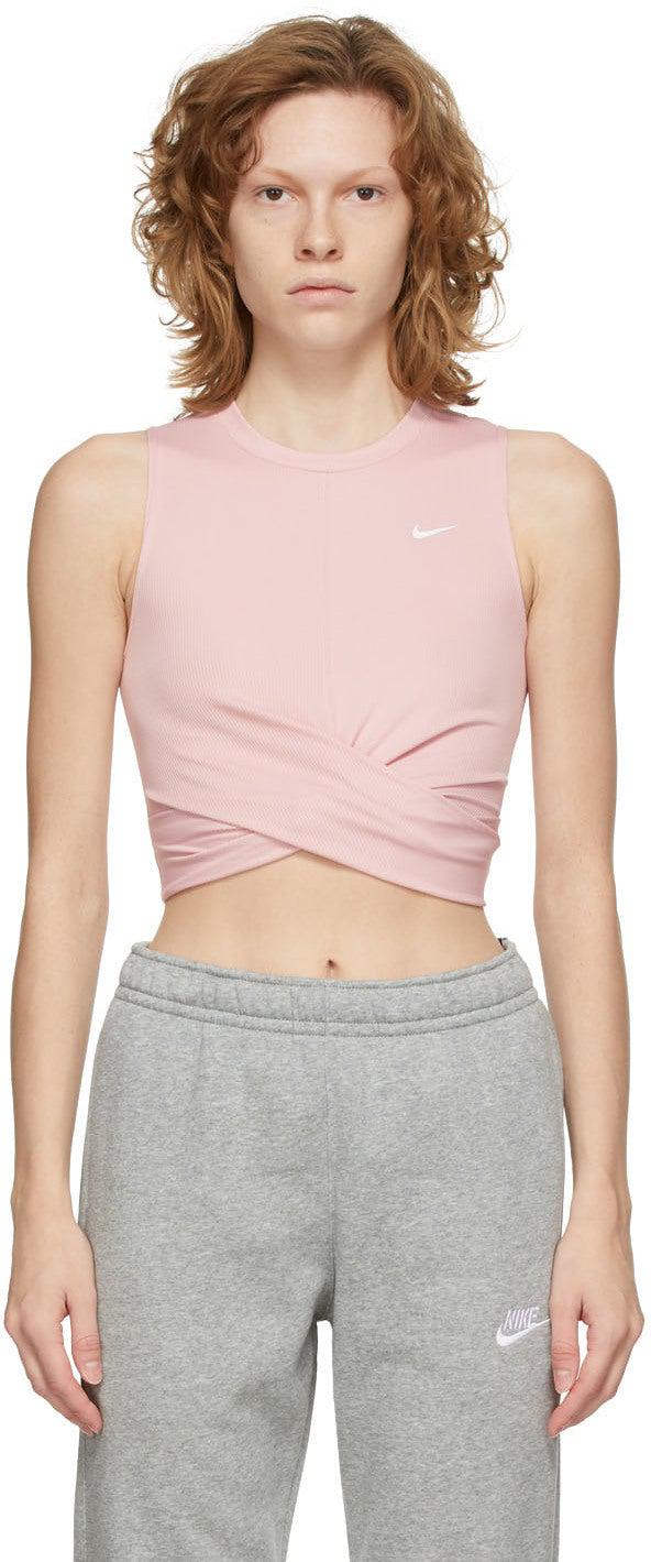 Sleeveless rib knit sport top striped in tones of pink. Paneled construction. Dri-FIT technology. Crewneck collar. Logo embroidered in white at chest. Twisted construction and gathering at front. Cropped hem. Supplier color: Pink glaze/White 100% polyester. Brand: Nike