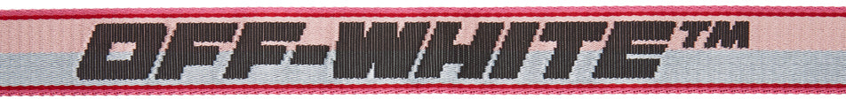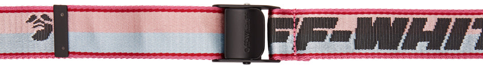 Nylon-blend webbing belt in pink and blue. Jacquard logo pattern woven in black and red throughout. Logo engraved at cinch fastening. Black hardware. Supplier color: Fuchsia Textile. Brand: Off-White