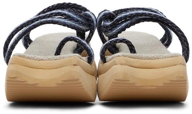 Braided cord slip-on sandals in white and tones of blue. Signature modified open square toe. Fixed straps at vamp. Canvas footbed in beige. Treaded foam rubber sole in beige. Approx. 1.5 platform; 2.25 heel. Supplier color: Blue Upper: textile. Sole: rubber. Brand: Paula Canovas Del Vas