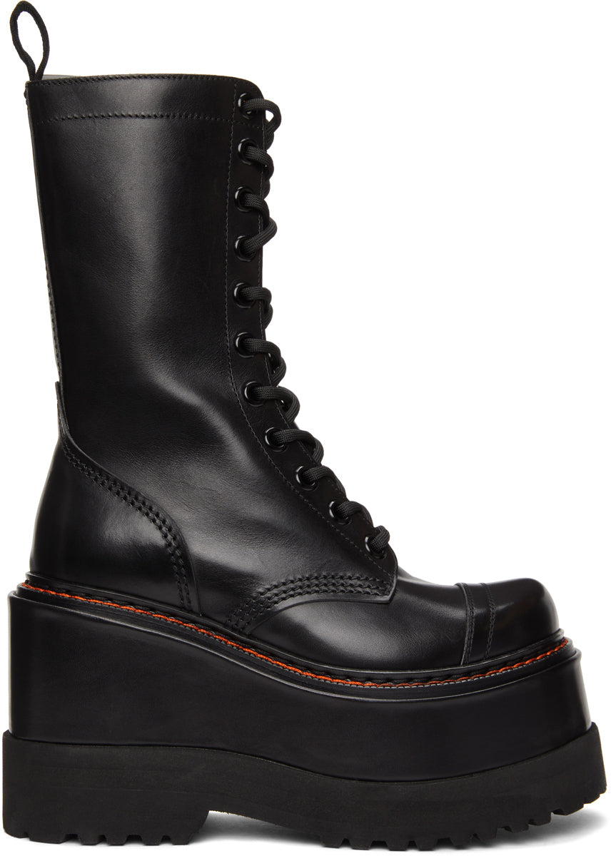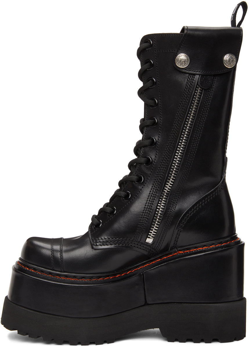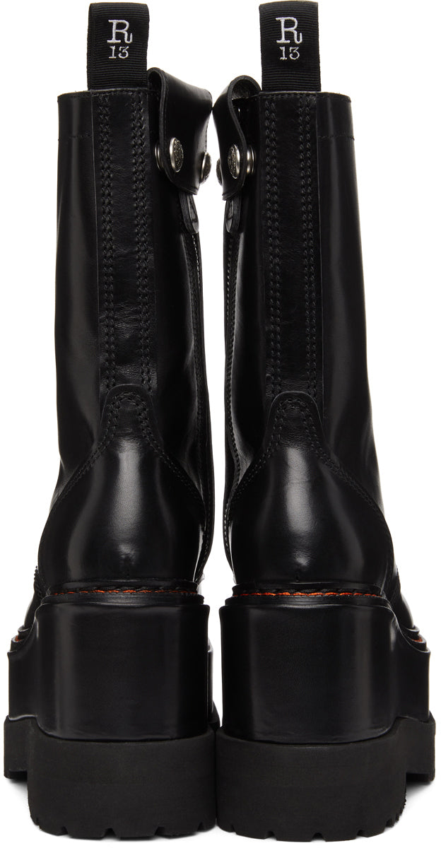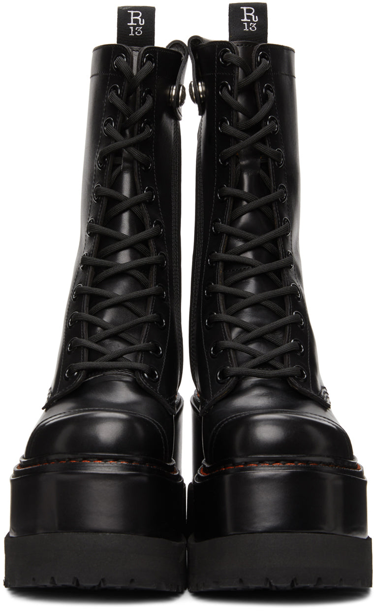 Mid-calf buffed leather boots in black. Round toe. Tonal lace-up closure. Tonal webbing pull-loop featuring logo embroidered in white at heel collar. Press-stud tab and zip closure at inner side. Topstitching in orange at welt. Tonal leather platform sole. Tonal treaded Vibram® rubber outsole. Logo-engraved silver-tone hardware. Approx. 4 platform. Supplier color: Black Upper: leather. Sole: leather, rubber. Brand: 13