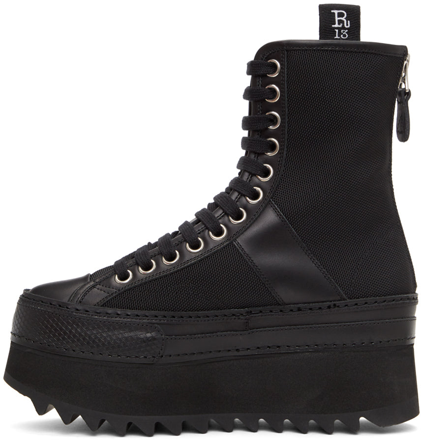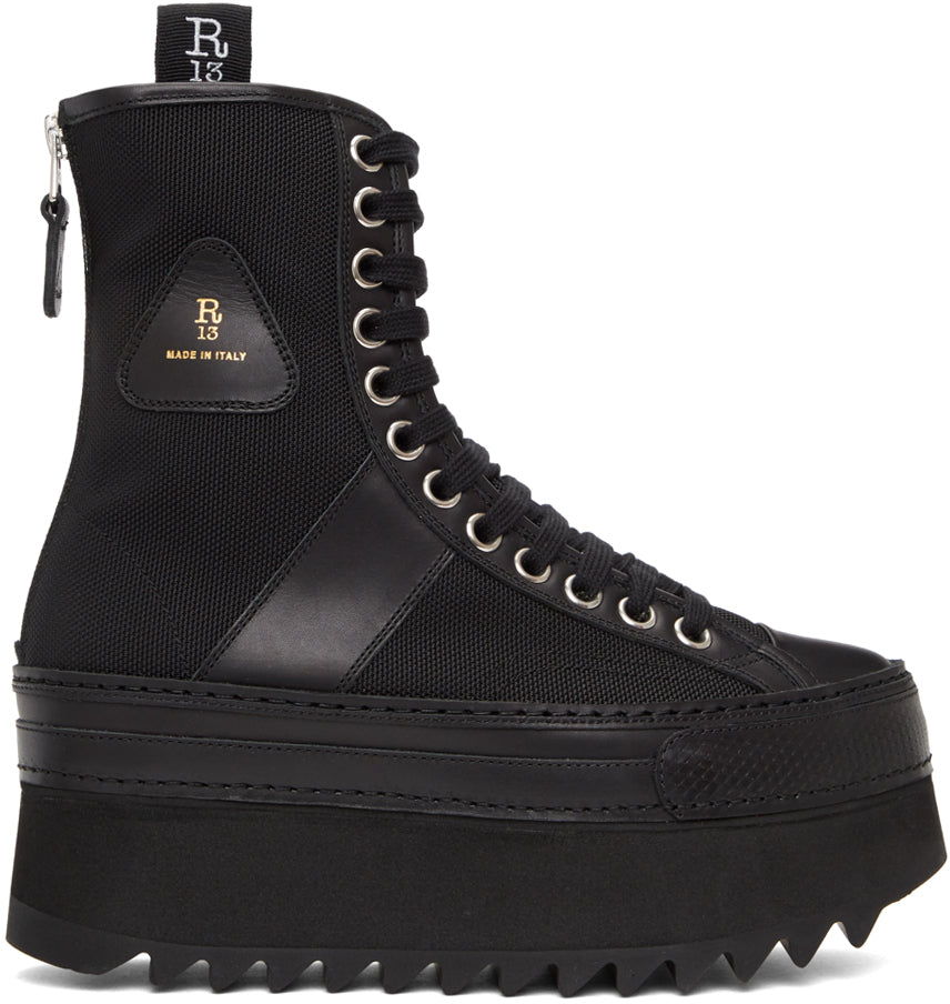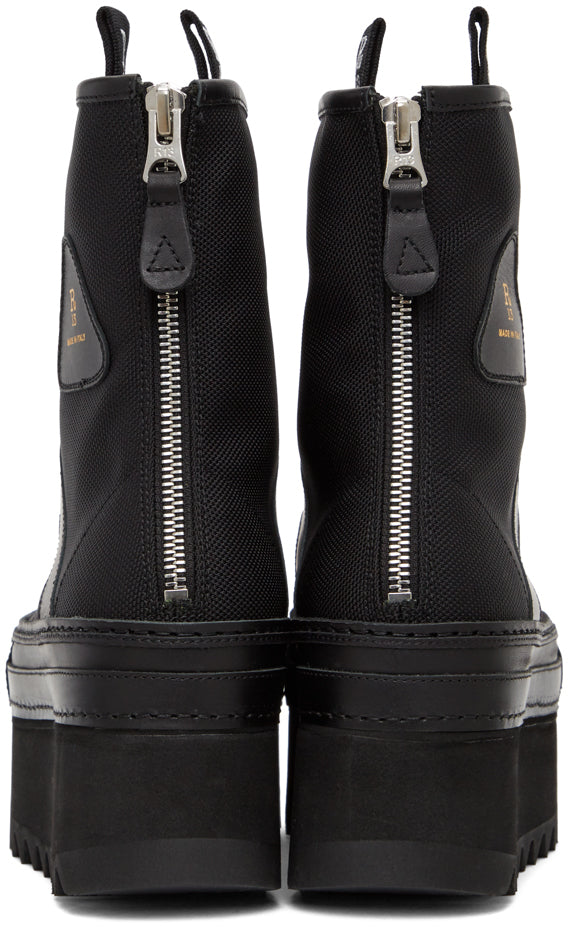 Mid-calf nylon canvas boots in black. Tonal leather trim throughout. Round toe. Tonal lace-up closure. Twin logo-woven grosgrain pull-loops at collar. Zip closure at heel. Leather logo patch at outer sides. Tonal treaded rubber platform sole. Silver-tone hardware. Approx. 2.5 platform. Supplier color: Black Upper: textile, leather. Sole: rubber. Brand: 13