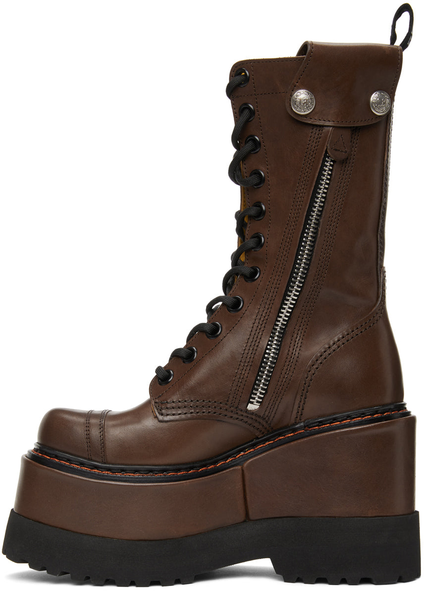Mid-calf buffed leather boots in brown. Round toe. Lace-up closure in black. Webbing pull-loop in black featuring logo embroidered in white at heel collar. Press-stud tab and zip closure at inner side. Topstitching in orange at welt. Tonal leather platform sole. Treaded Vibram® rubber outsole in black. Logo-engraved silver-tone hardware. Approx. 4 platform. Supplier color: Brown Upper: leather. Sole: leather, rubber. Brand: 13