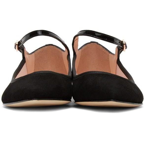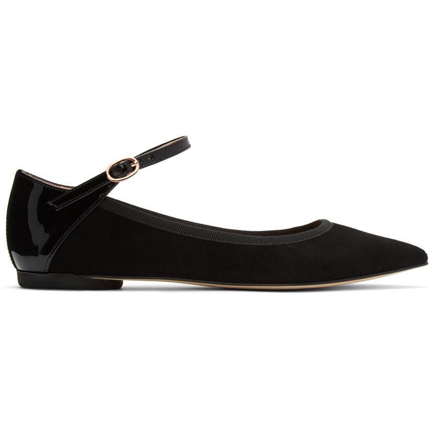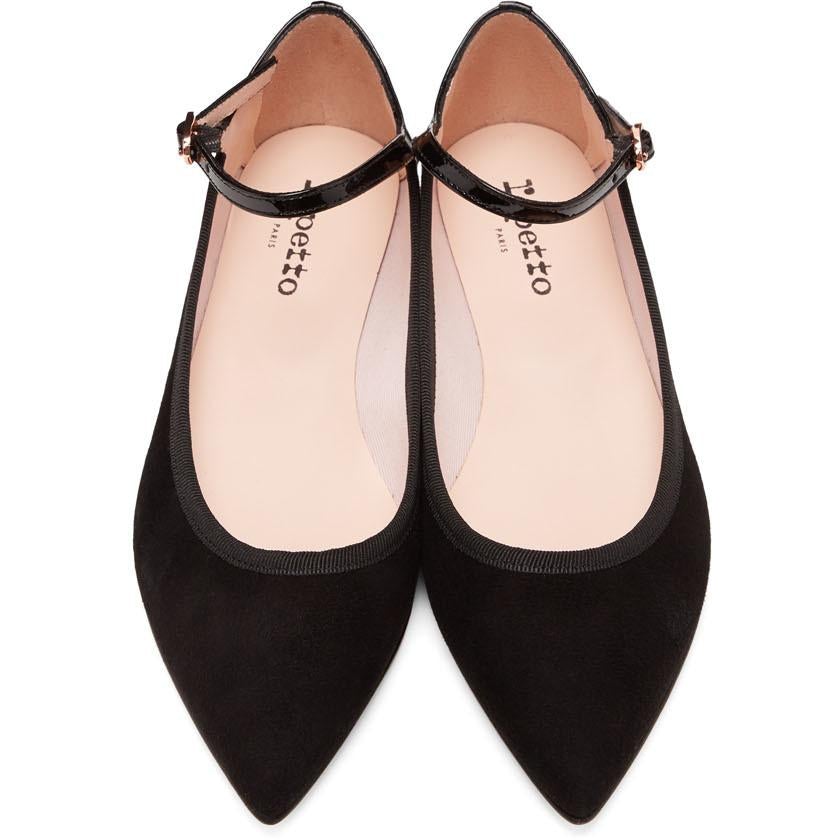 Goatskin suede ballerina flats in black. Pointed toe. Tonal grosgrain trim at collar. Adjustable pin-buckle ankle strap. Patent leather heel counter. Logo printed in black at pink calfskin footbed. Leather sole in beige. Supplier color: Black Upper: goatskin, leather. Sole: leather. Brand: Repetto