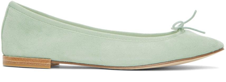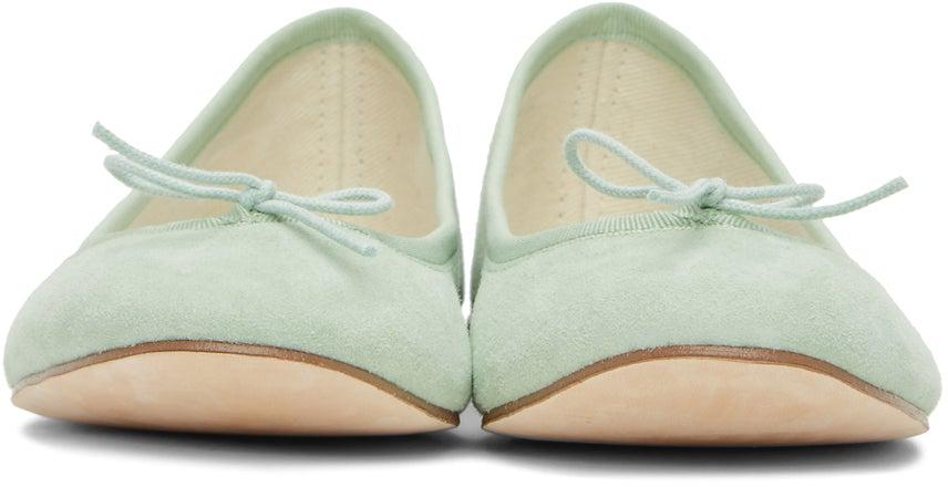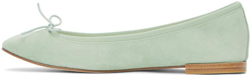 Goatskin suede ballerina flats in green. Round toe. Bow accent at vamp. Tonal grosgrain trim at collar. Logo printed in black at white calfskin footbed. Twill lining. Leather sole in beige with tan treaded rubber injection at heel. Supplier color: Pistachio green Upper: goatskin, calfskin. Sole: leather, rubber. Brand: Repetto