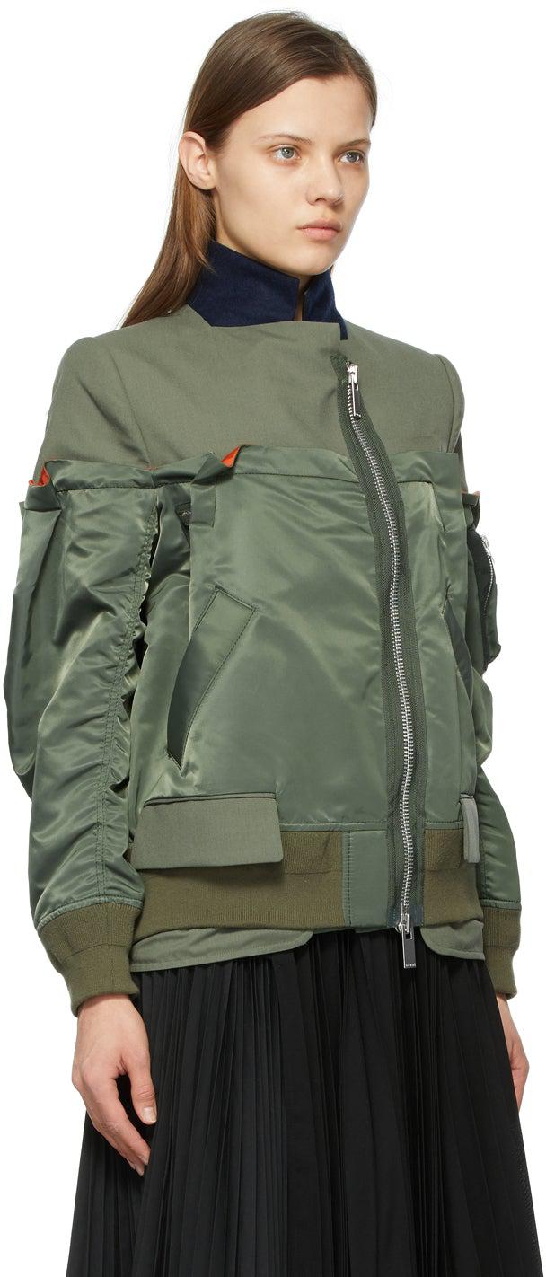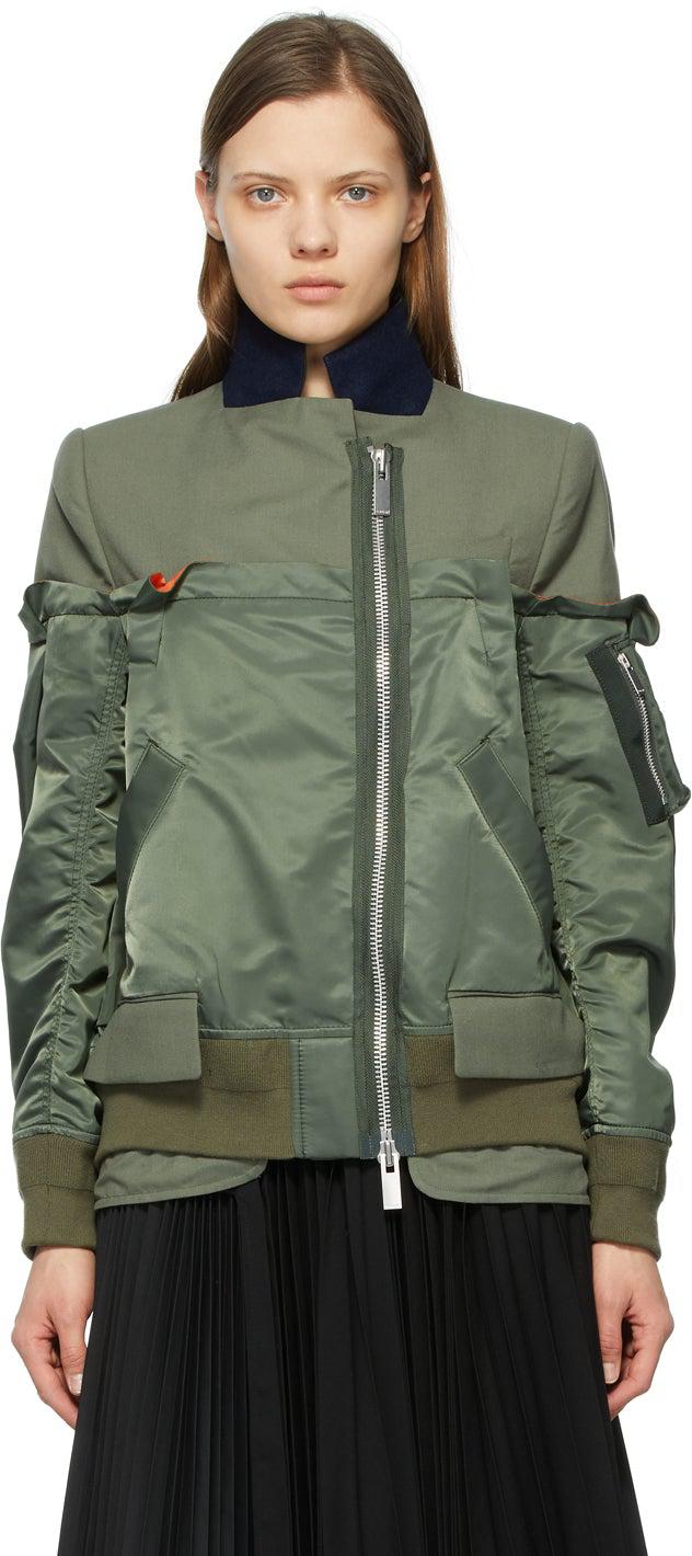 Long sleeve paneled technical satin bomber jacket in khaki. Layered construction. Felted wool stand collar in navy. Offset zip closure at front. Tonal webbing press-stud tabs and trim at chest. Welt pockets and flap pockets at waist. Utility pocket and zippered pocket at upper sleeve. Rib knit cuffs and asymmetric hem. Fully lined. Logo-engraved silver-tone hardware. Supplier color: Khaki Body: 80% polyester, 20% wool. Trim 1: 100% nylon. Trim 2: 100% polyester. Trim 3: 50% cotton, 50% polyester. Trim 4: 70% wool, 20% polyester, 5% acrylic, 5% nylon. Lining: 100% cupro. Padding: 100% polyester. Brand: Sacai