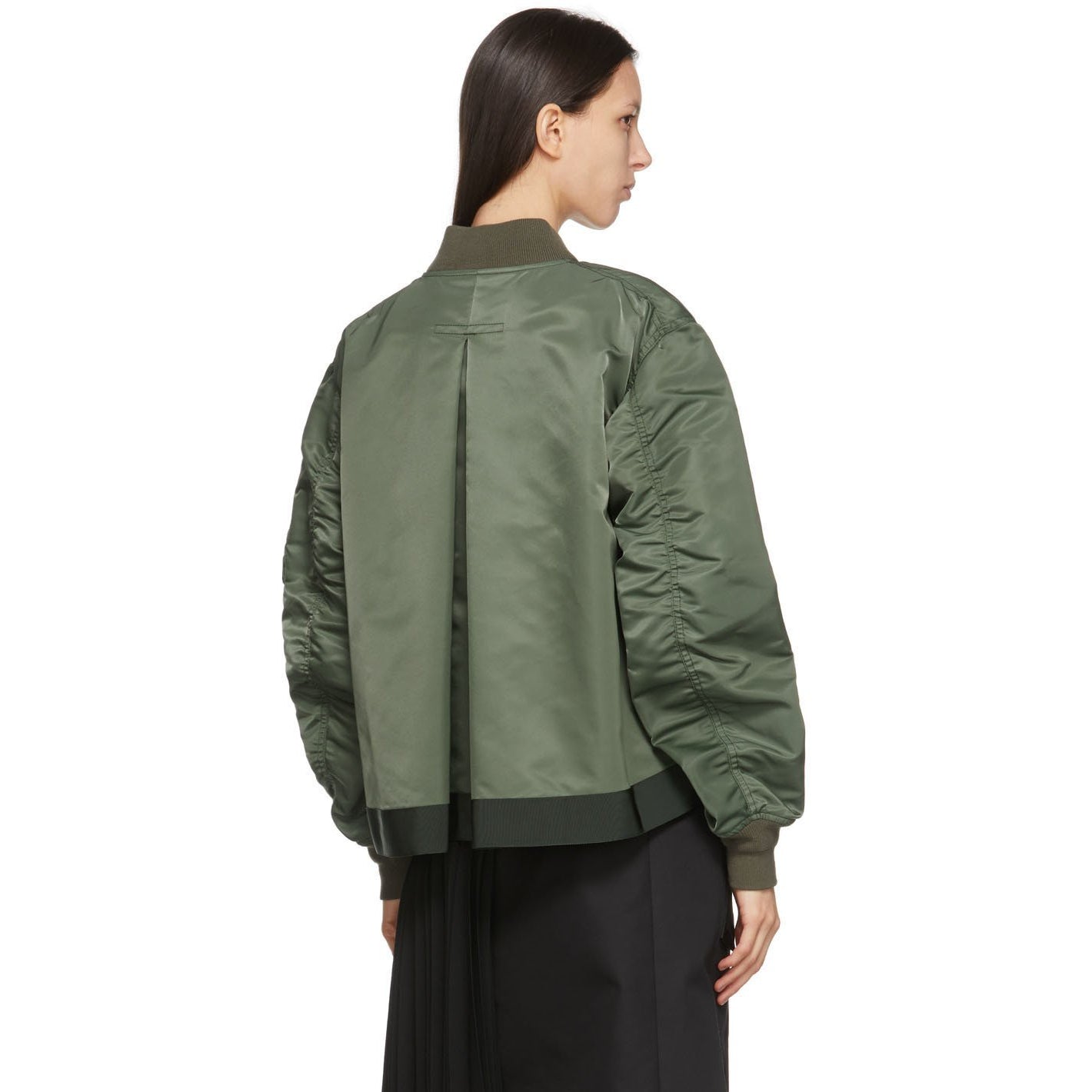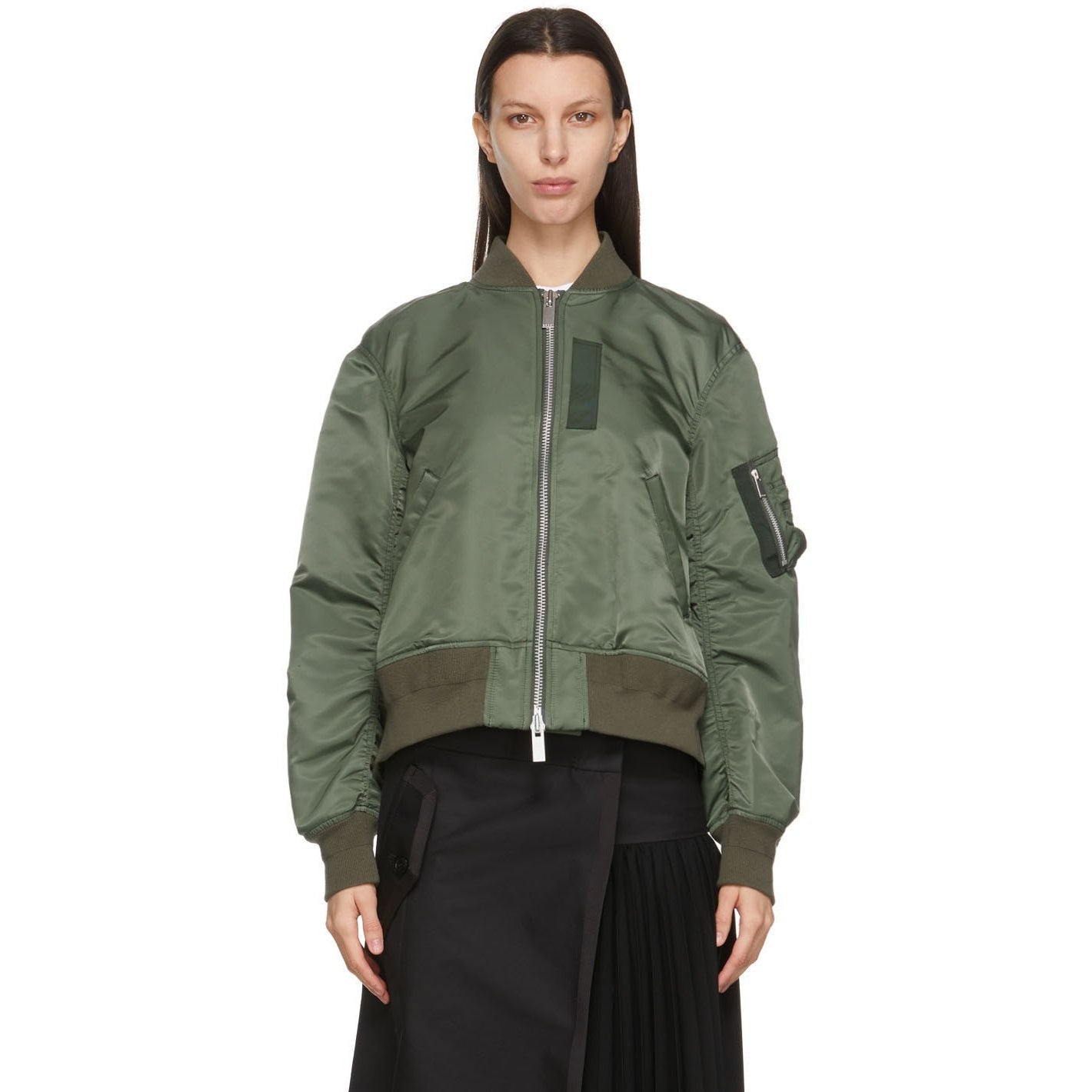 Long sleeve nylon bomber jacket in khaki. Rib knit stand collar, cuffs, and front hem. Two-way zip closure at front. Tonal grosgrain trim at chest and back hem. Welt pockets at waist. Zippered pocket and four pen slots at sleeve. Ruching at sleeves. Inverted box pleat at back. Cupro satin lining in orange. Fully lined. Silver-tone hardware. Supplier color: Khaki Body: 100% nylon. Trim: 50% cotton, 50% polyester. Lining: 100% cupro. Brand: Sacai